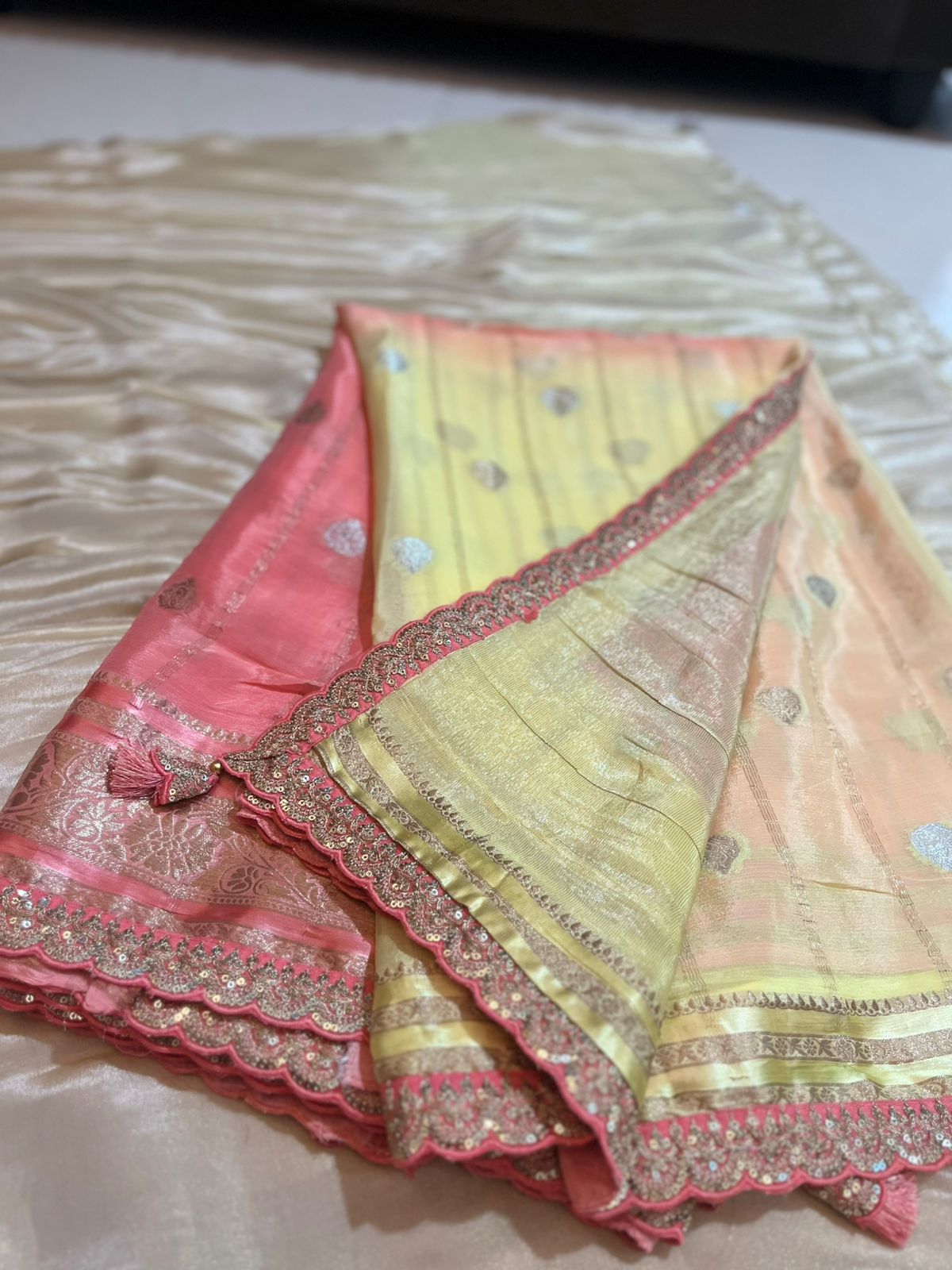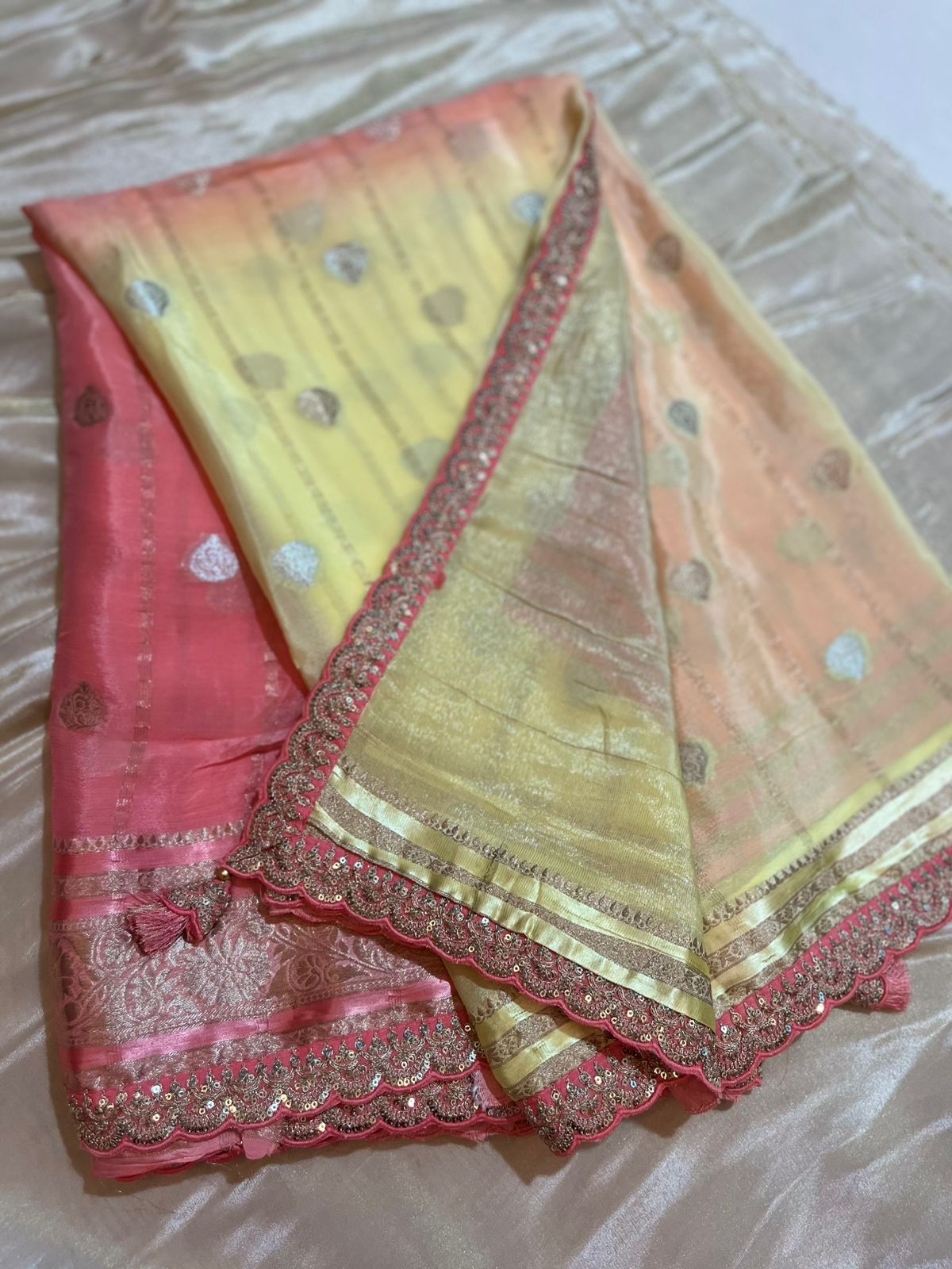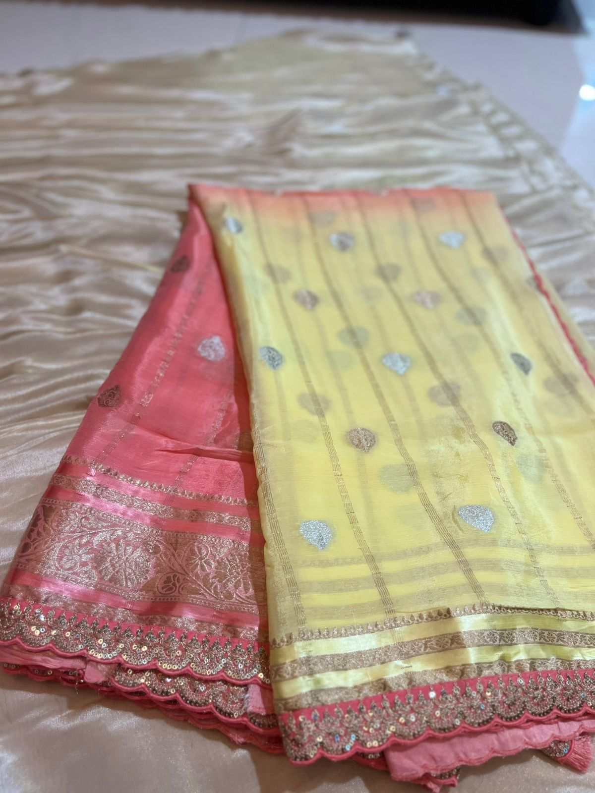 With its base in pure crepe, this saree exudes comfort with style: the fabric forms a graceful fall and an elegant pleat silhouette that enhances movement. The intricate border detailing—Maggam lace border—elevates the saree into a piece of refined artistry. The result: effortlessly wearable minimalism that blends elegance, ease, and modern finesse.