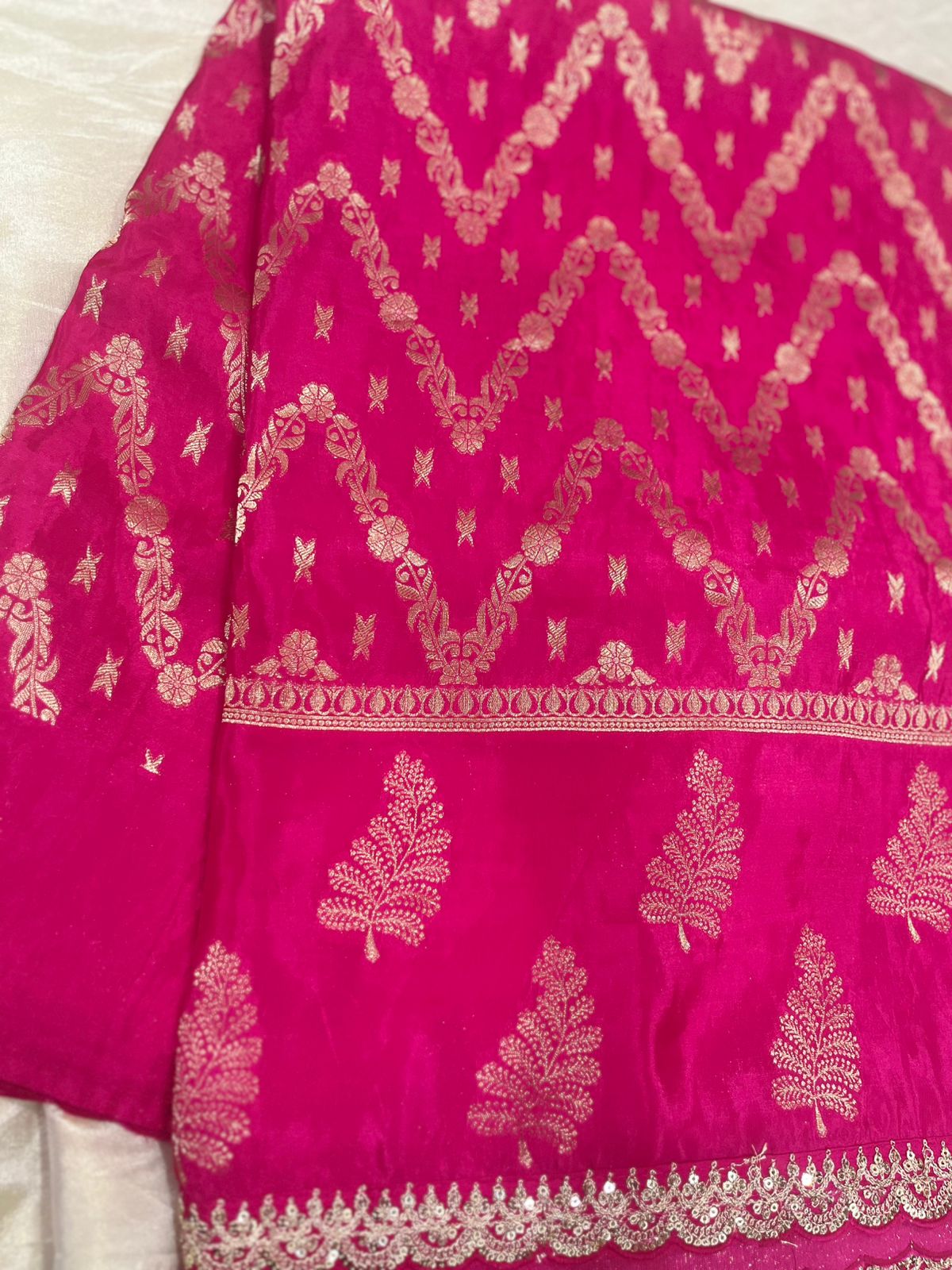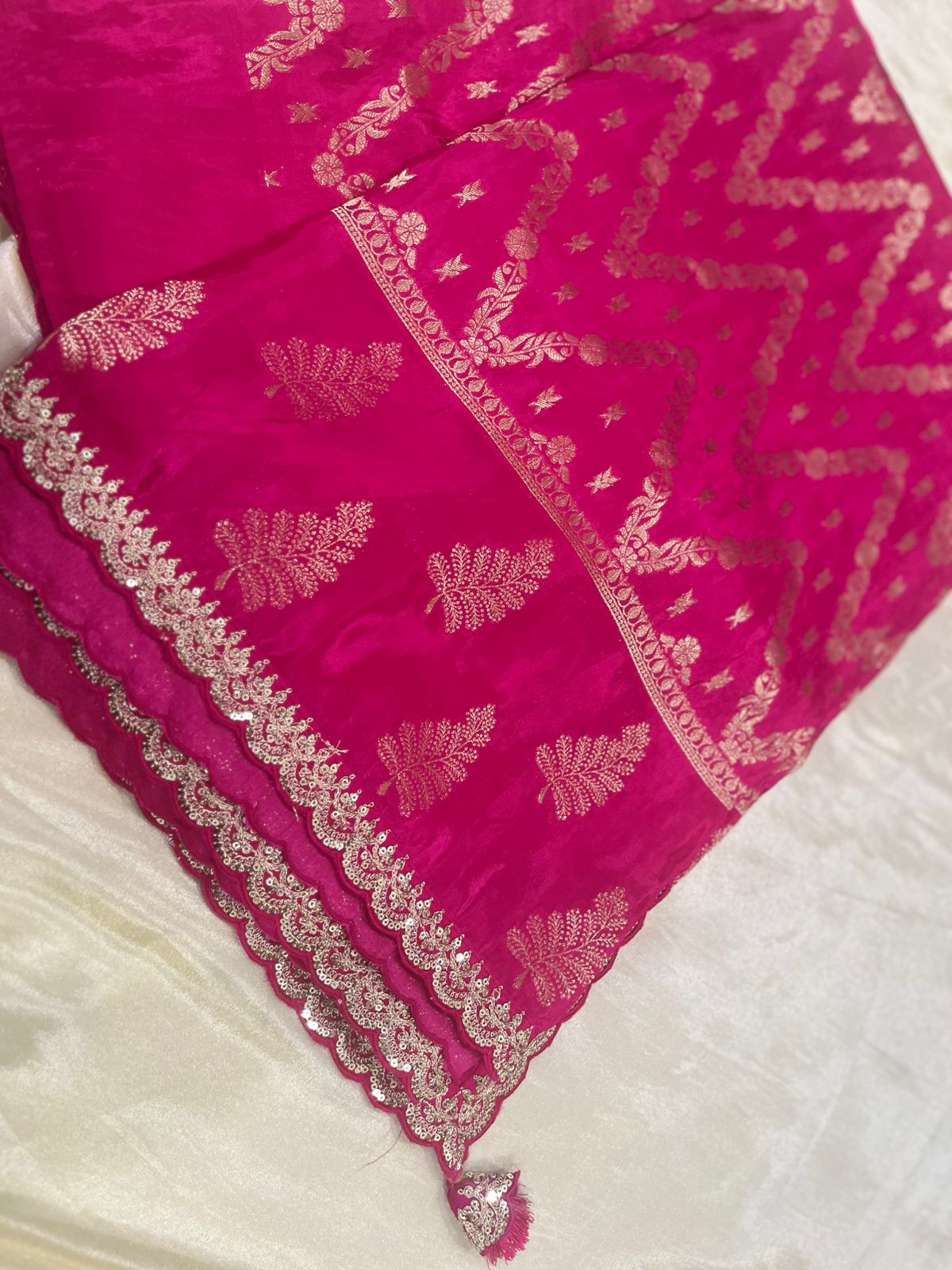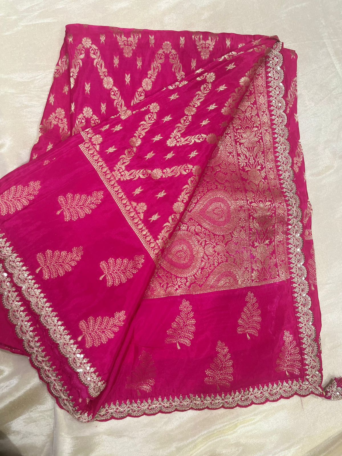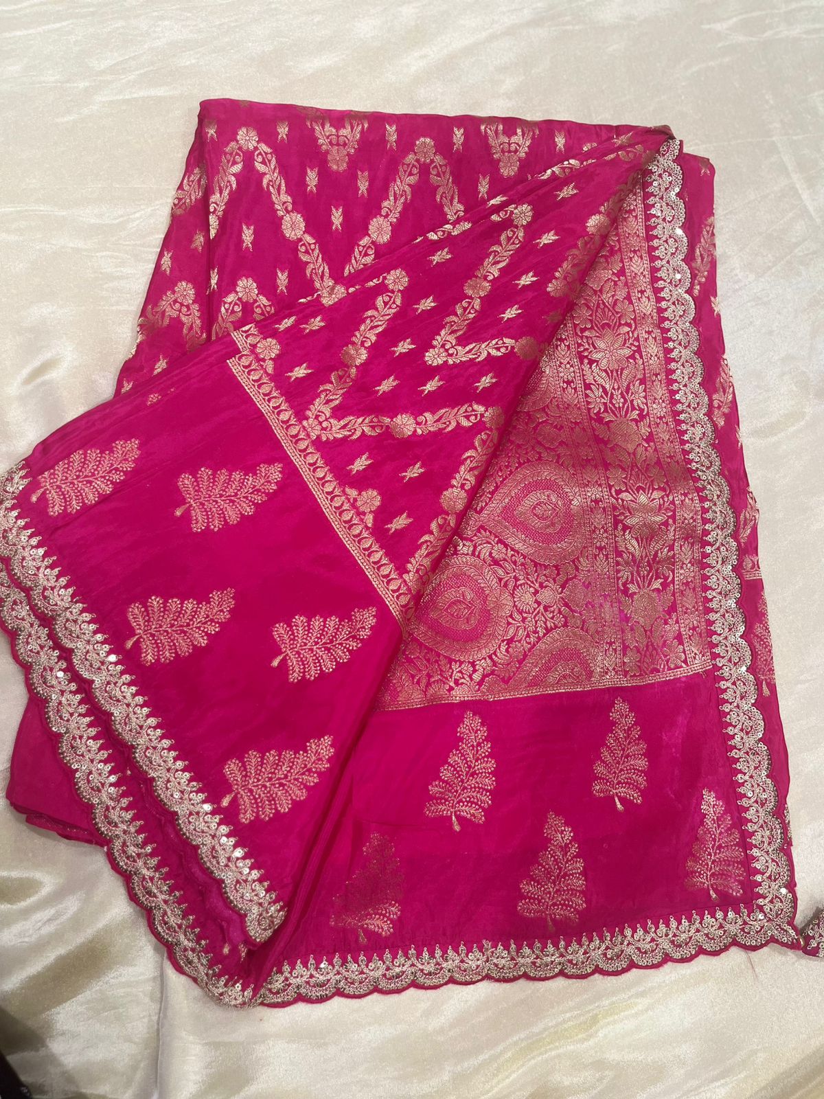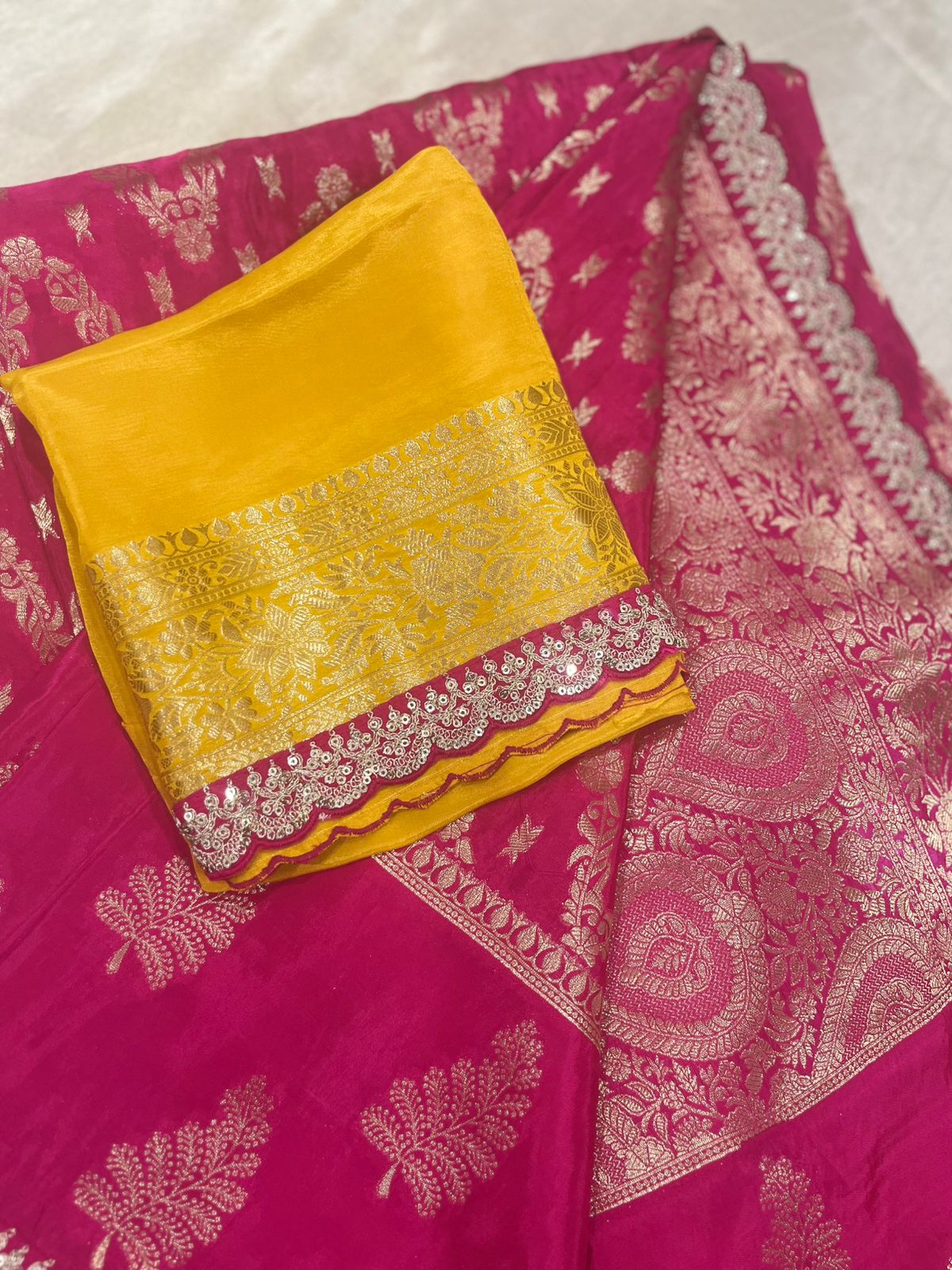 “Fushia pink Chinnon saree paired with a vibrant yellow blouse, enhanced with maggam lace detailing. Featuring a rich, elegant pallu — perfect for festive occasions and timeless celebrations.”