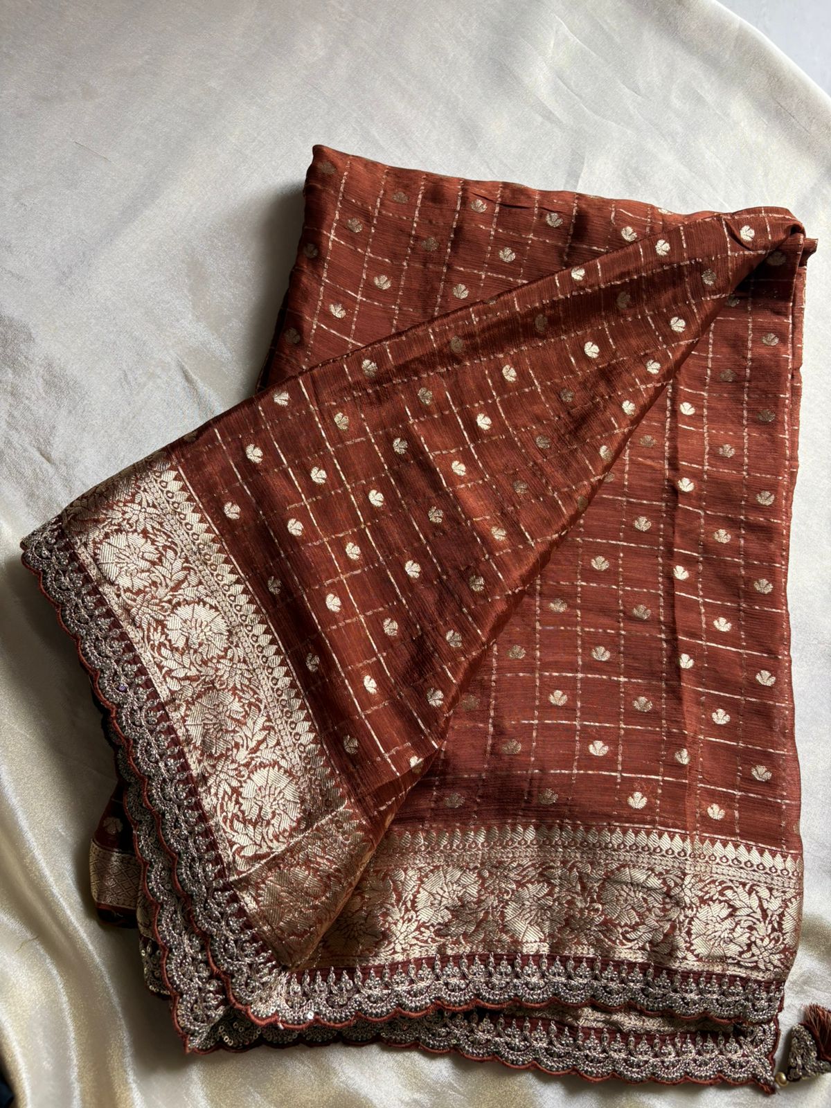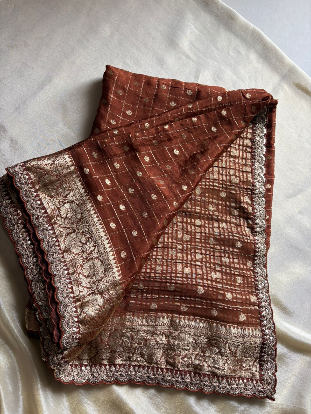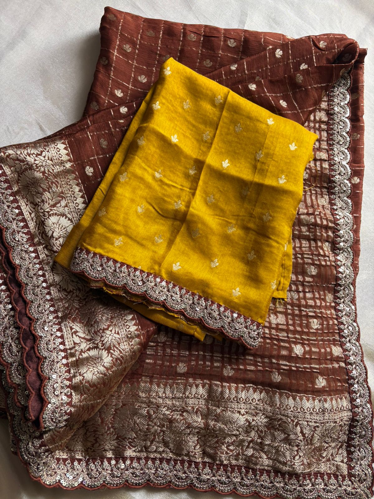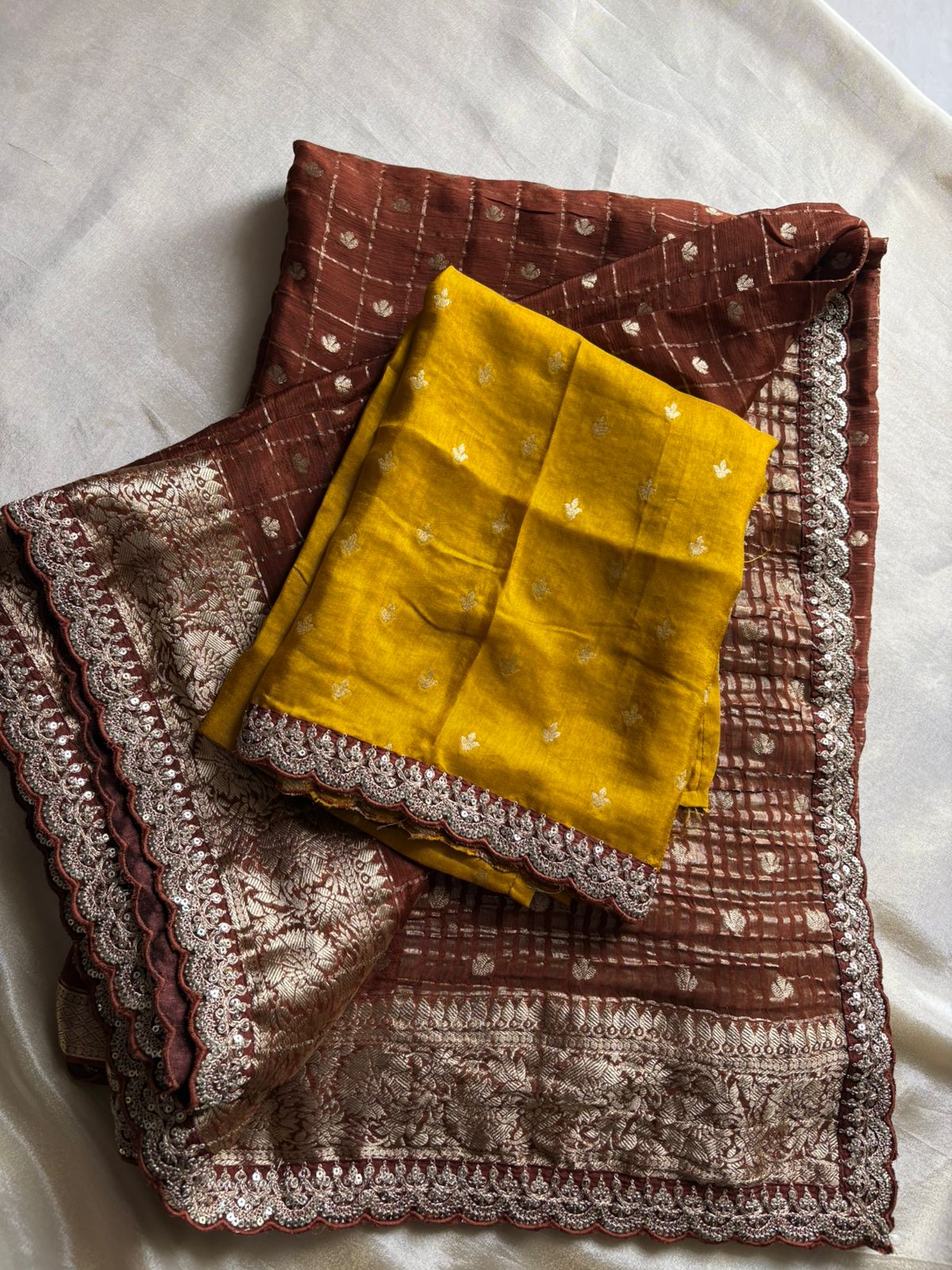 Drift into grace with this soft Rust brown georgette saree—light as air, beautifully pleated, Paired with a vibrant yellow blouse in silk with Maggam lace border, the ensemble balances ethereal poise with the warmth of color. Perfect for festive luncheons or intimate evening events, it blends comfortable breathability with modern sophistication.