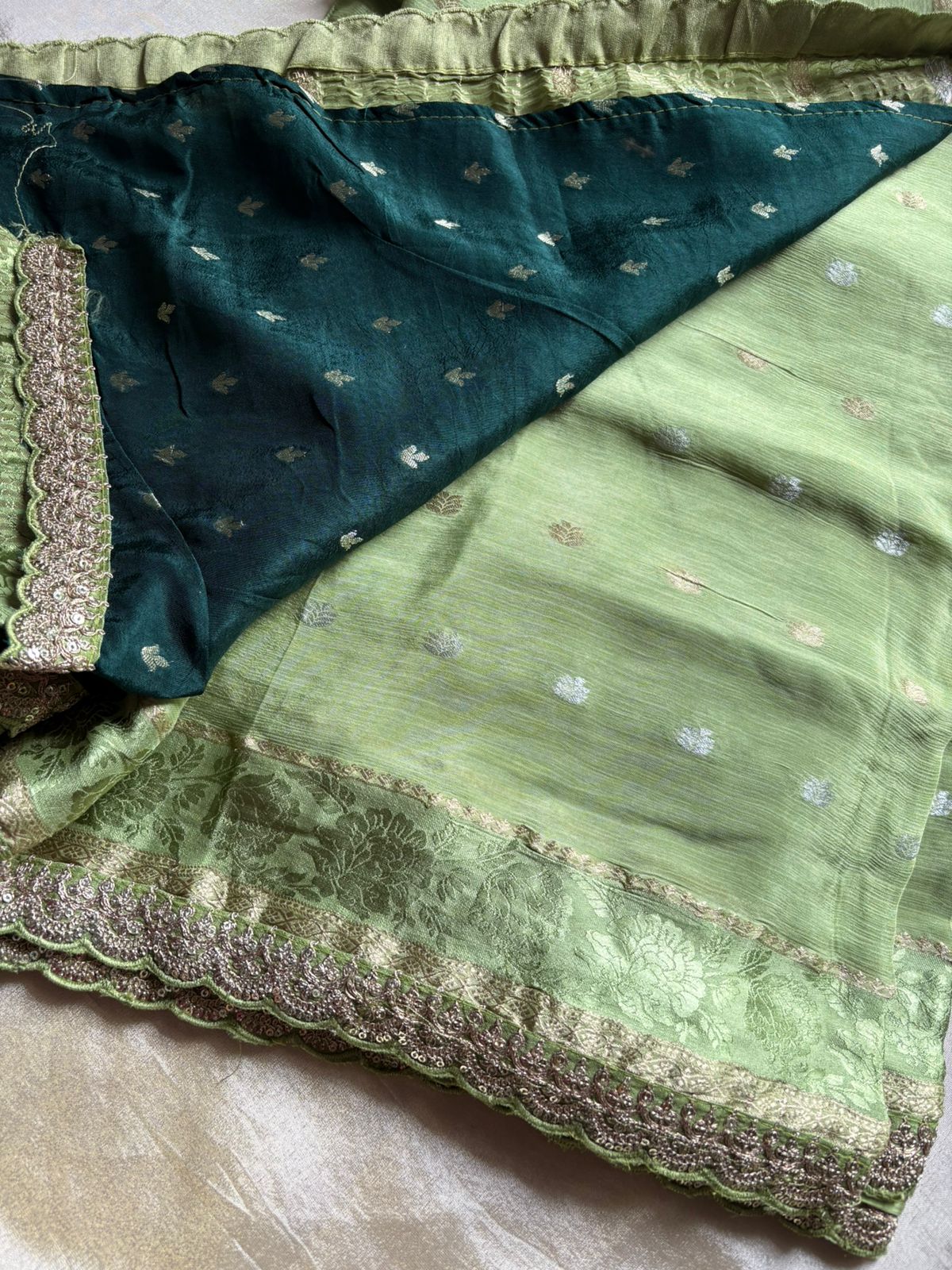 Drift into grace with this soft Green chinnon georgette saree—light as air, beautifully pleated, Paired with a vibrant Dark green blouse in silk with Maggam lace border, the ensemble balances ethereal poise with the warmth of color. Perfect for festive luncheons or intimate evening events, it blends comfortable breathability with modern sophistication.