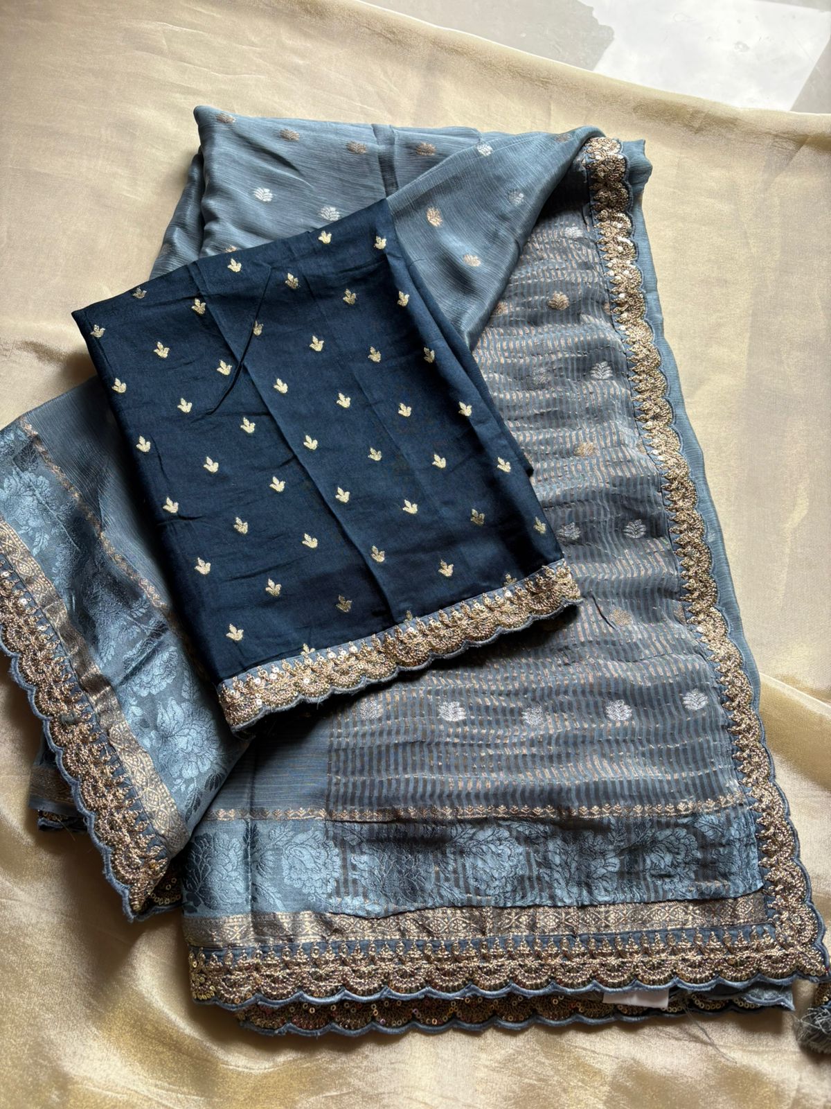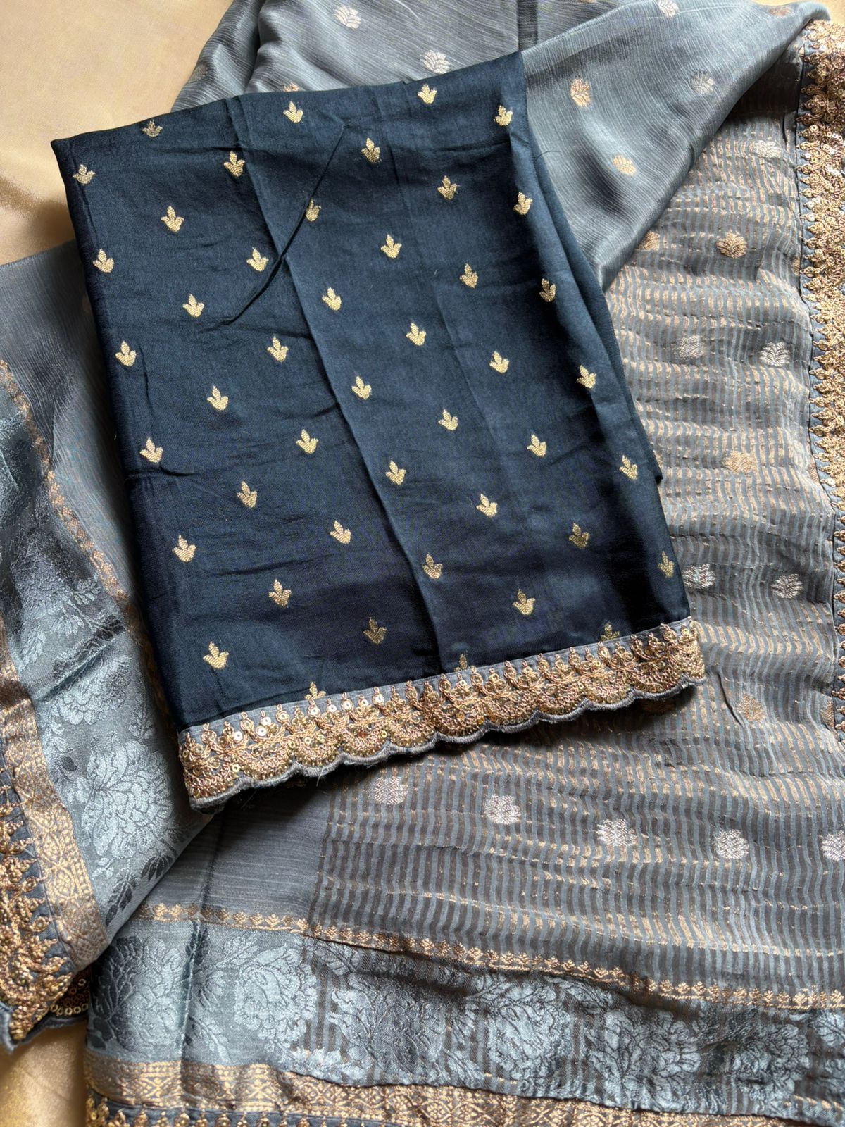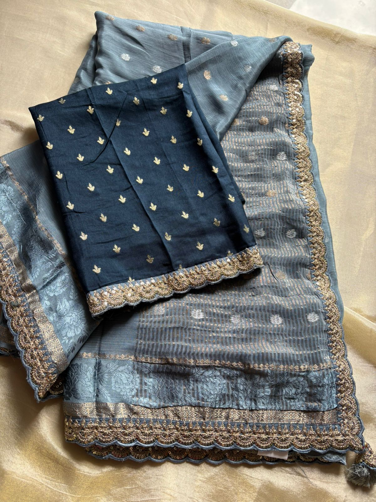 Drift into grace with this soft chinnon georgette saree—light as air, beautifully pleated, Paired with a vibrant Contrast blouse in silk with Maggam lace border, the ensemble balances ethereal poise with the warmth of color. Perfect for festive luncheons or intimate evening events, it blends comfortable breathability with modern sophistication.