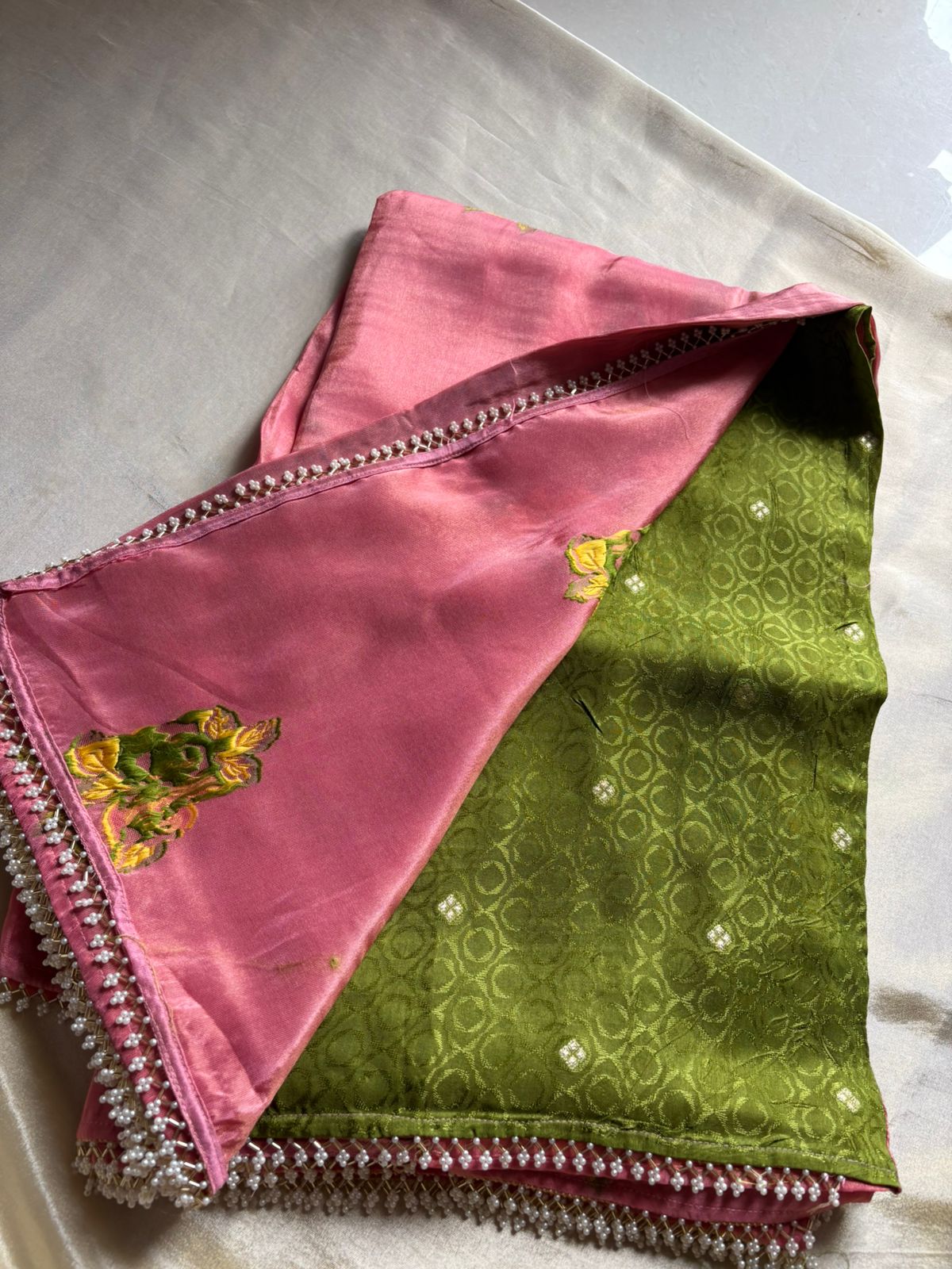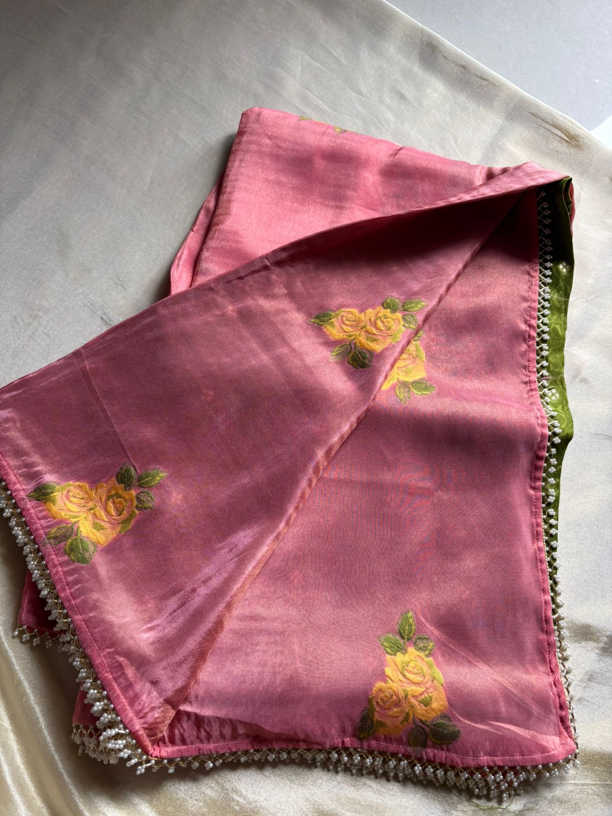 “A radiant silk tissue saree, threaded with woven floral motifs across the body for delicate texture and a graceful shimmer. The border features a hand‑attached line of simple glass and seed beads, introducing just the right sparkle at the hem and pallu. Styled with a contrast blouse, this combination blends luminous minimalism with bold color—chic and elegant for any festive or formal gathering.”