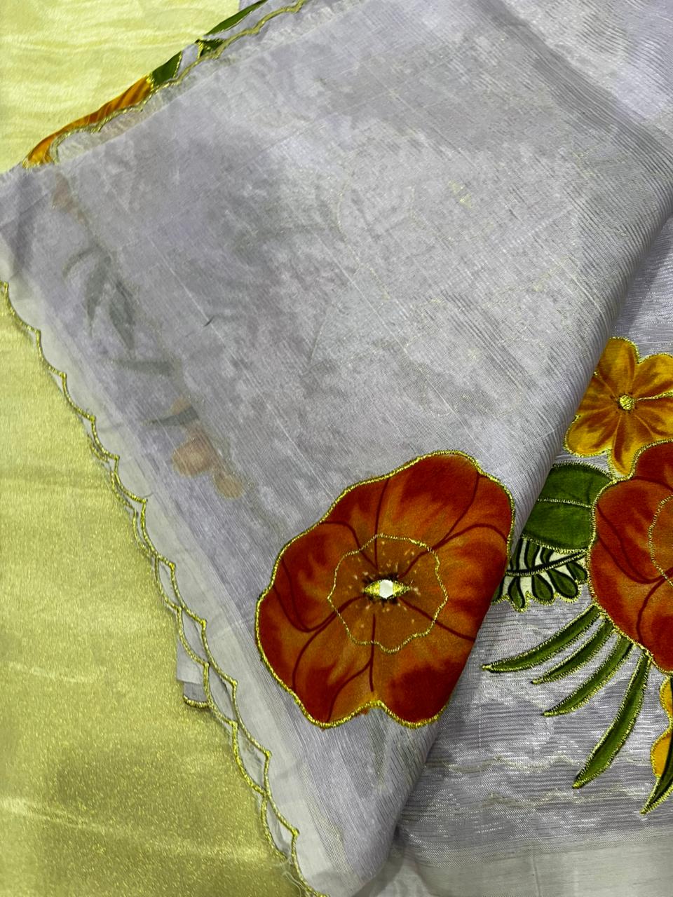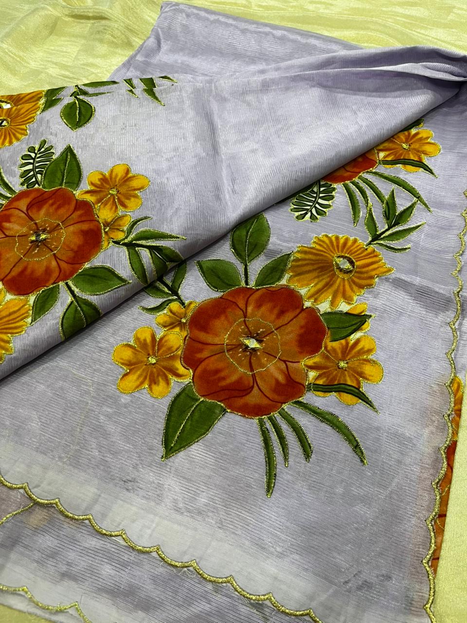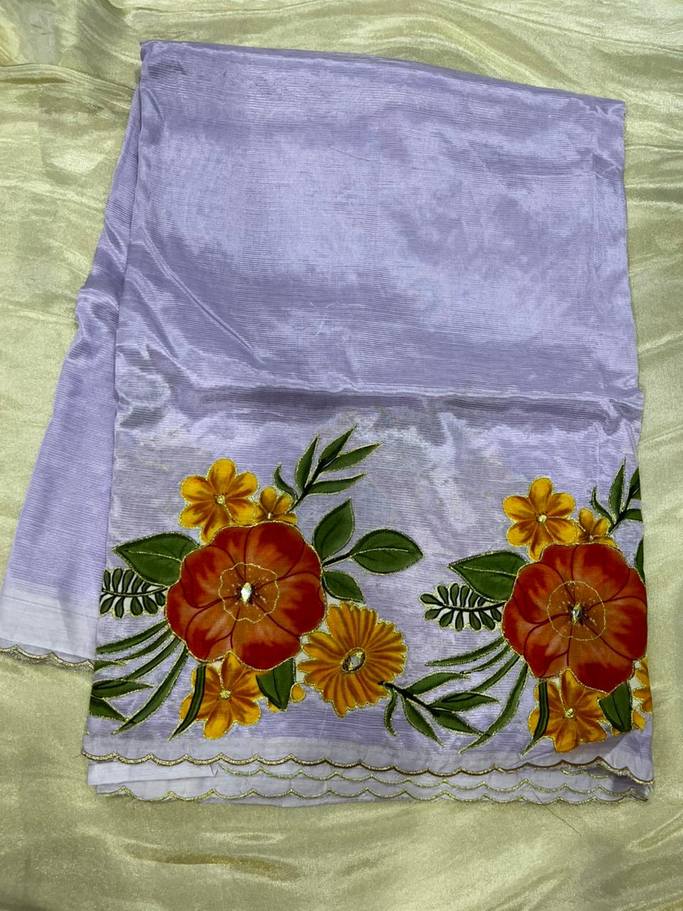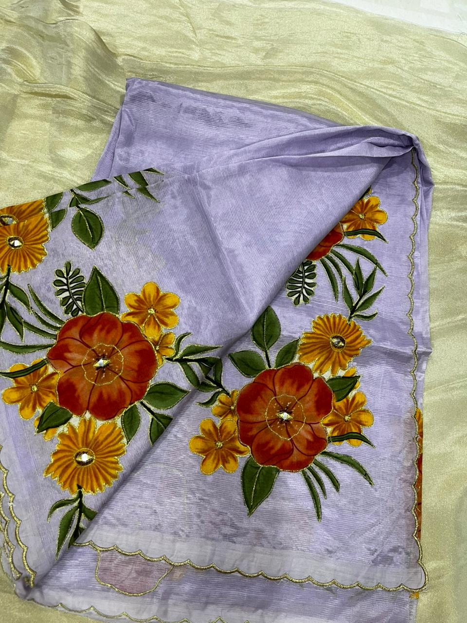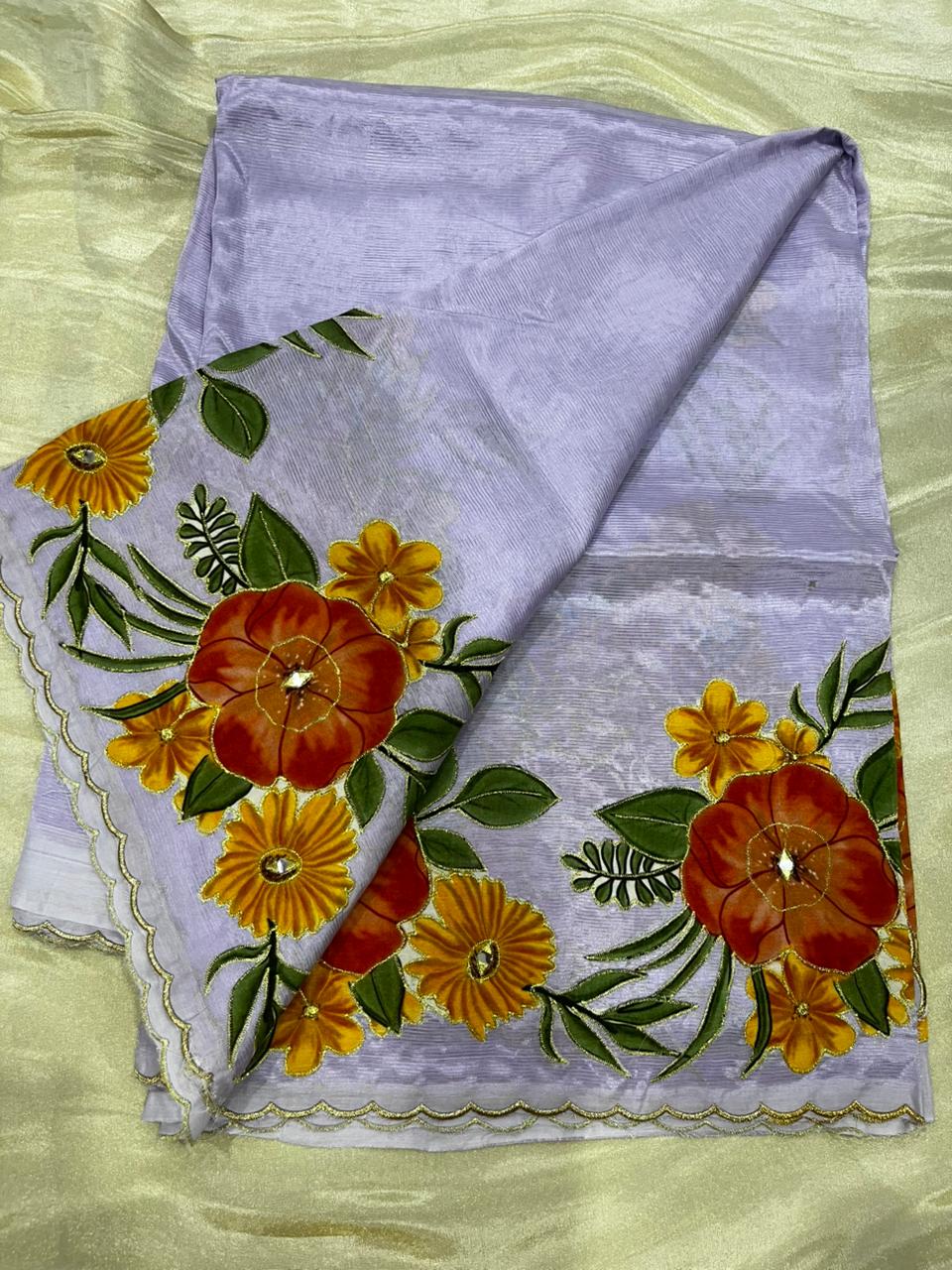 A pure Mangalgiri pattu saree in serene lilac, highlighted with exquisite applique detailing and scalloped borders that add a touch of refined elegance.