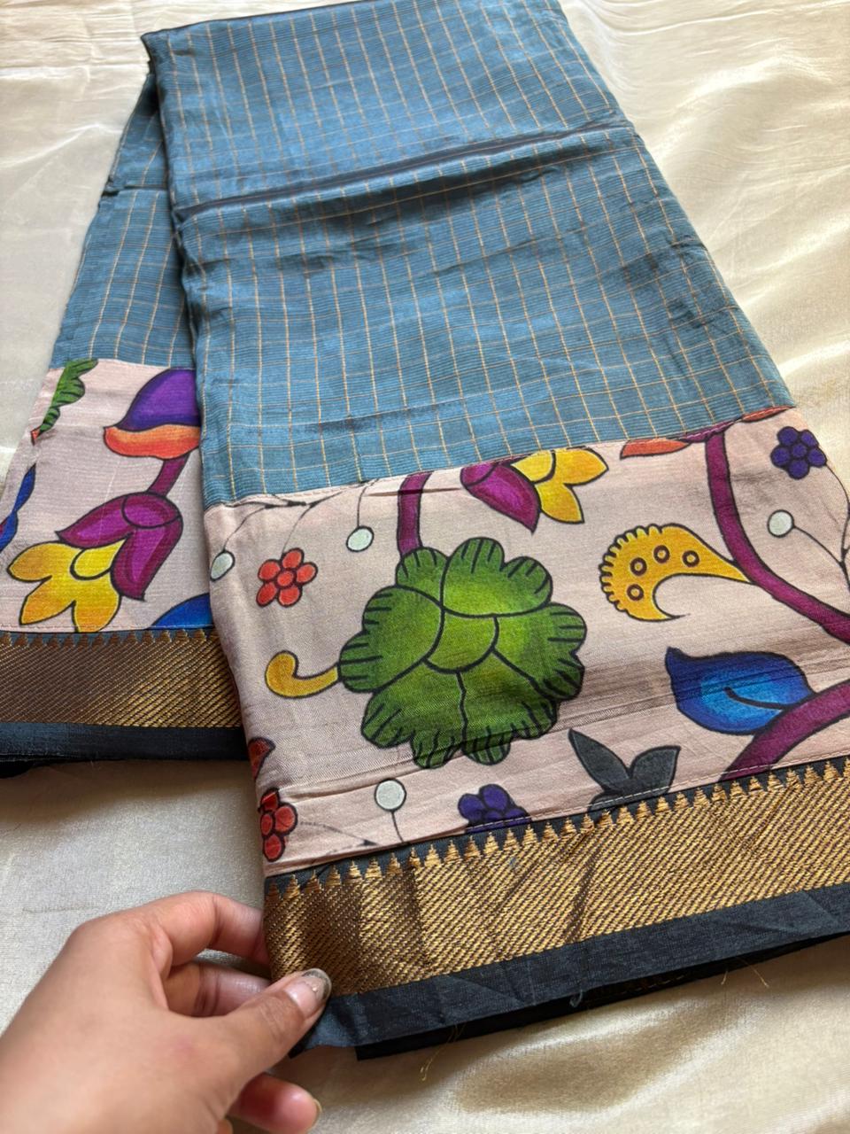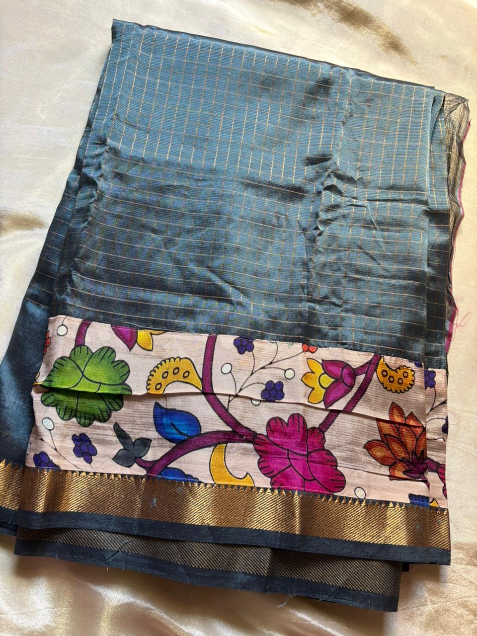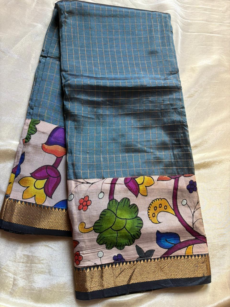 This Mangalgiri Pure Pattu Saree features exquisite Kalamkari patchwork borders on both sides and the pallu, paired with a running blouse enhanced with a Kalamkari border.