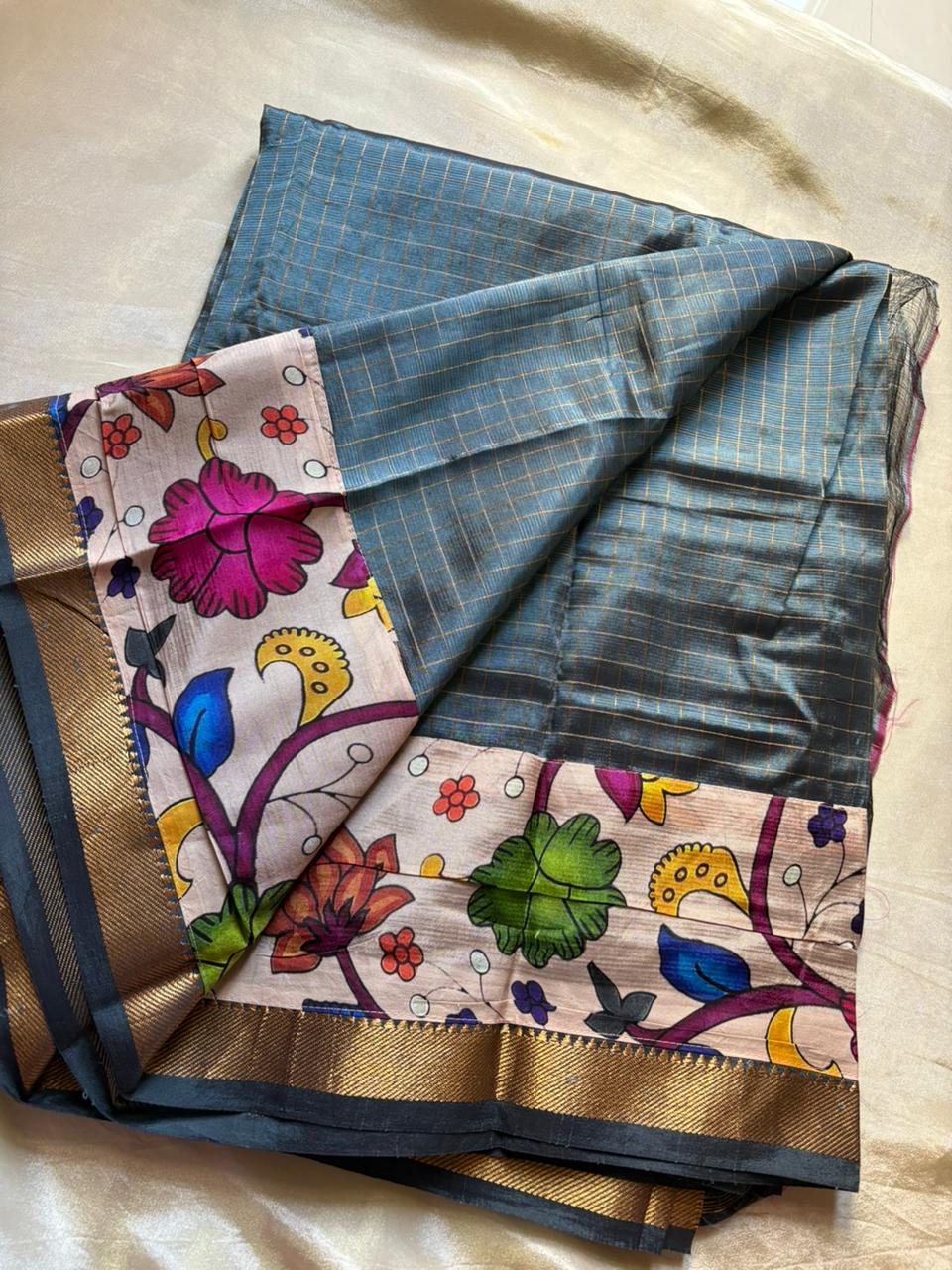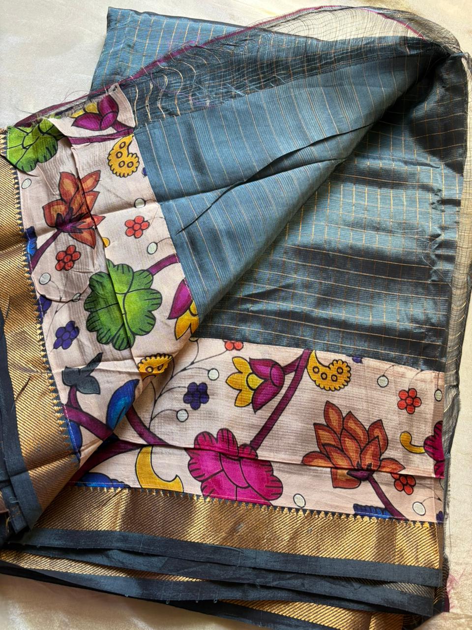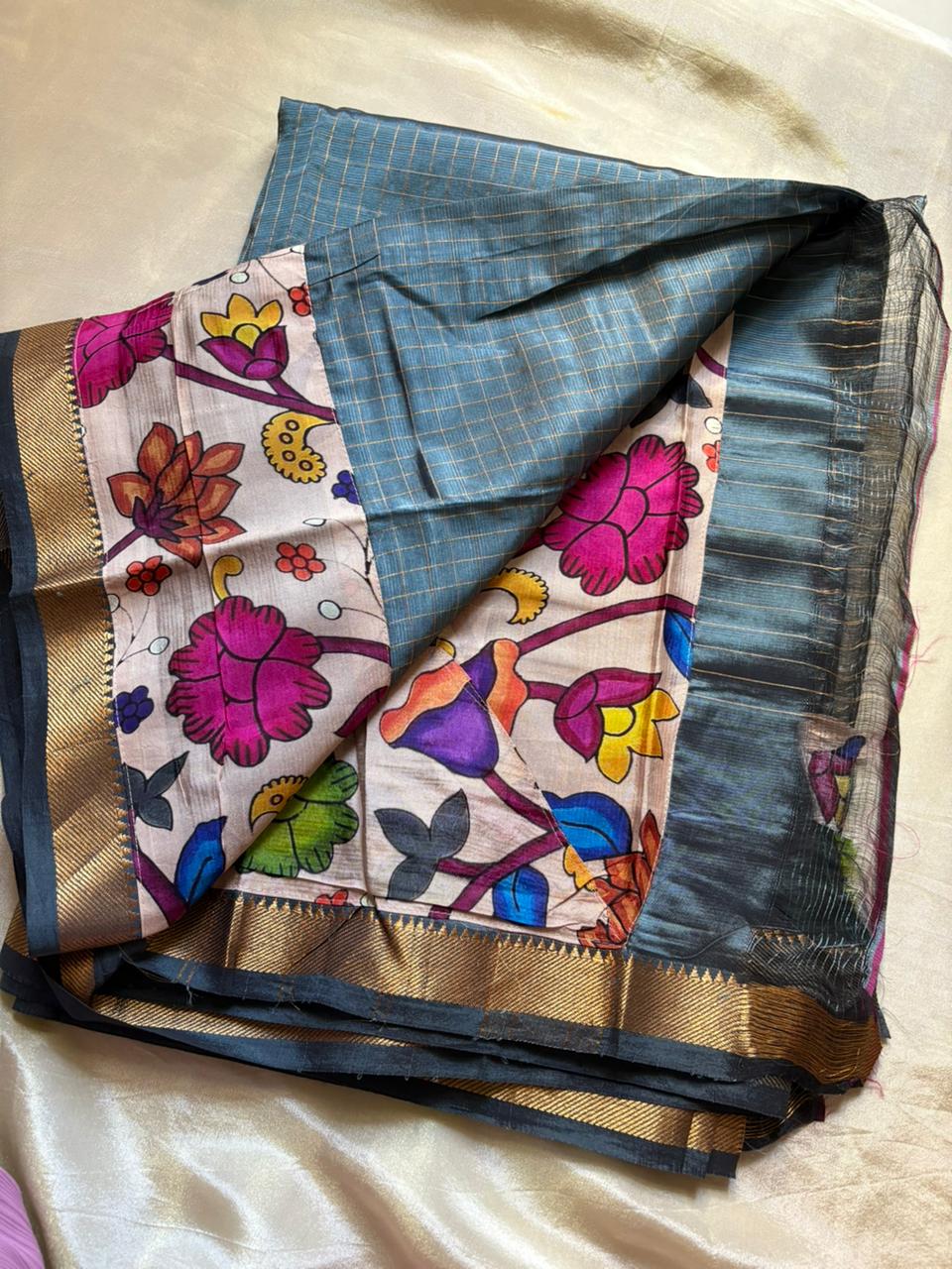 This Mangalgiri Pure Pattu Saree features exquisite Kalamkari patchwork borders on both sides and the pallu, paired with a running blouse enhanced with a Kalamkari border.