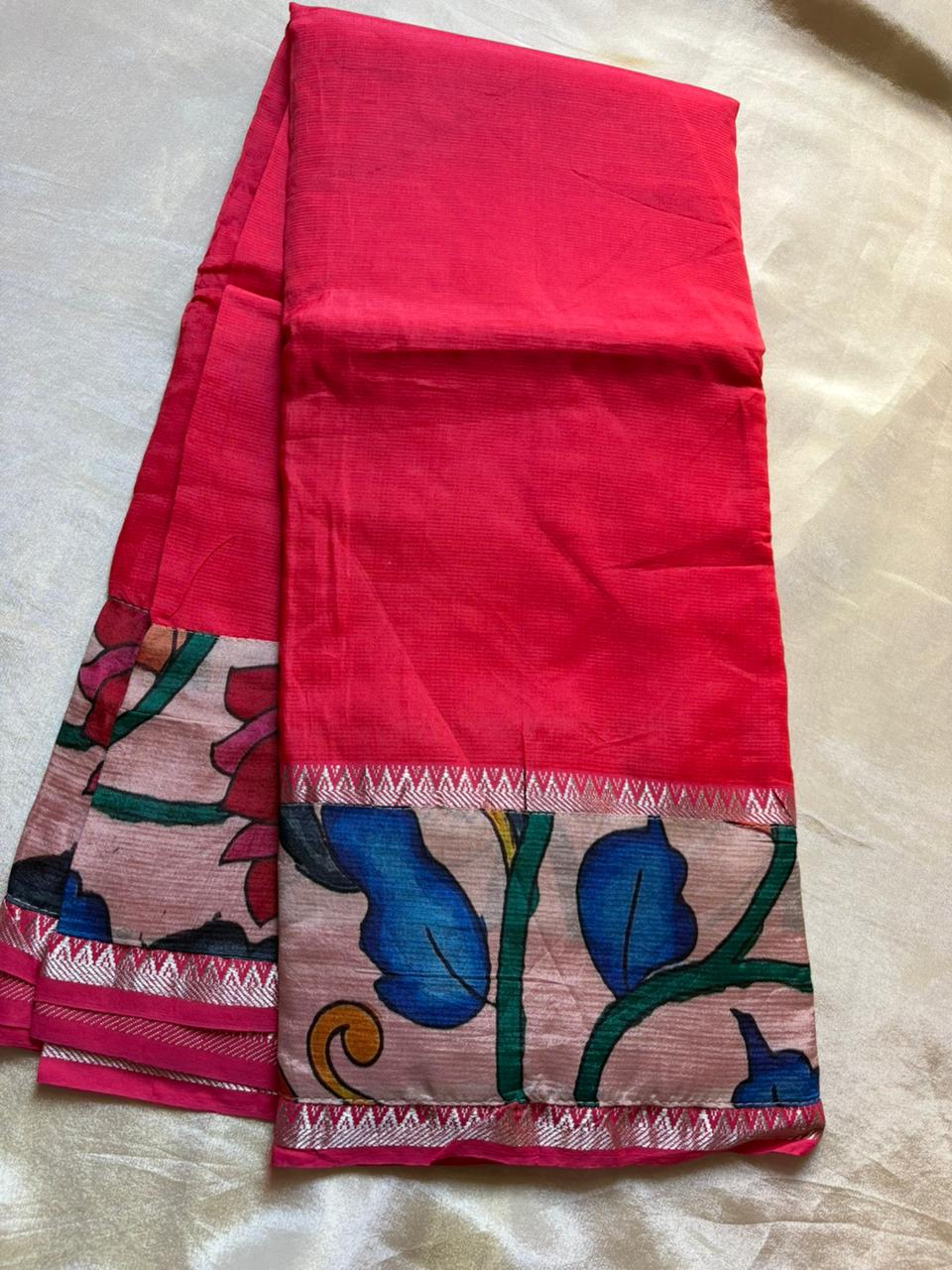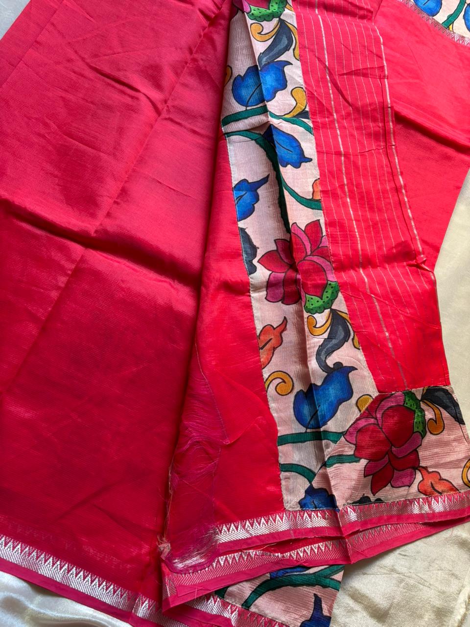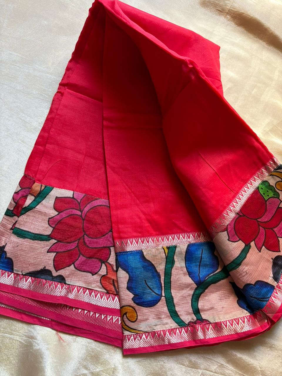 This Mangalgiri Pure Pattu Saree features exquisite Kalamkari patchwork borders on both sides and the pallu, paired with a running blouse enhanced with a Kalamkari border.