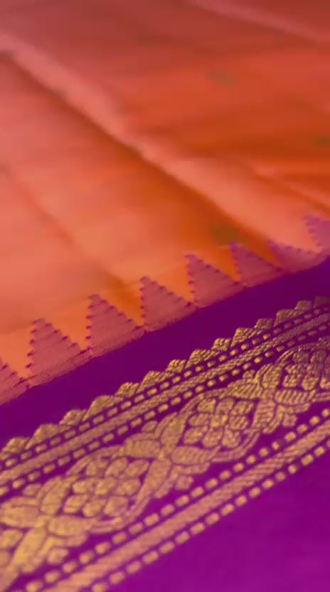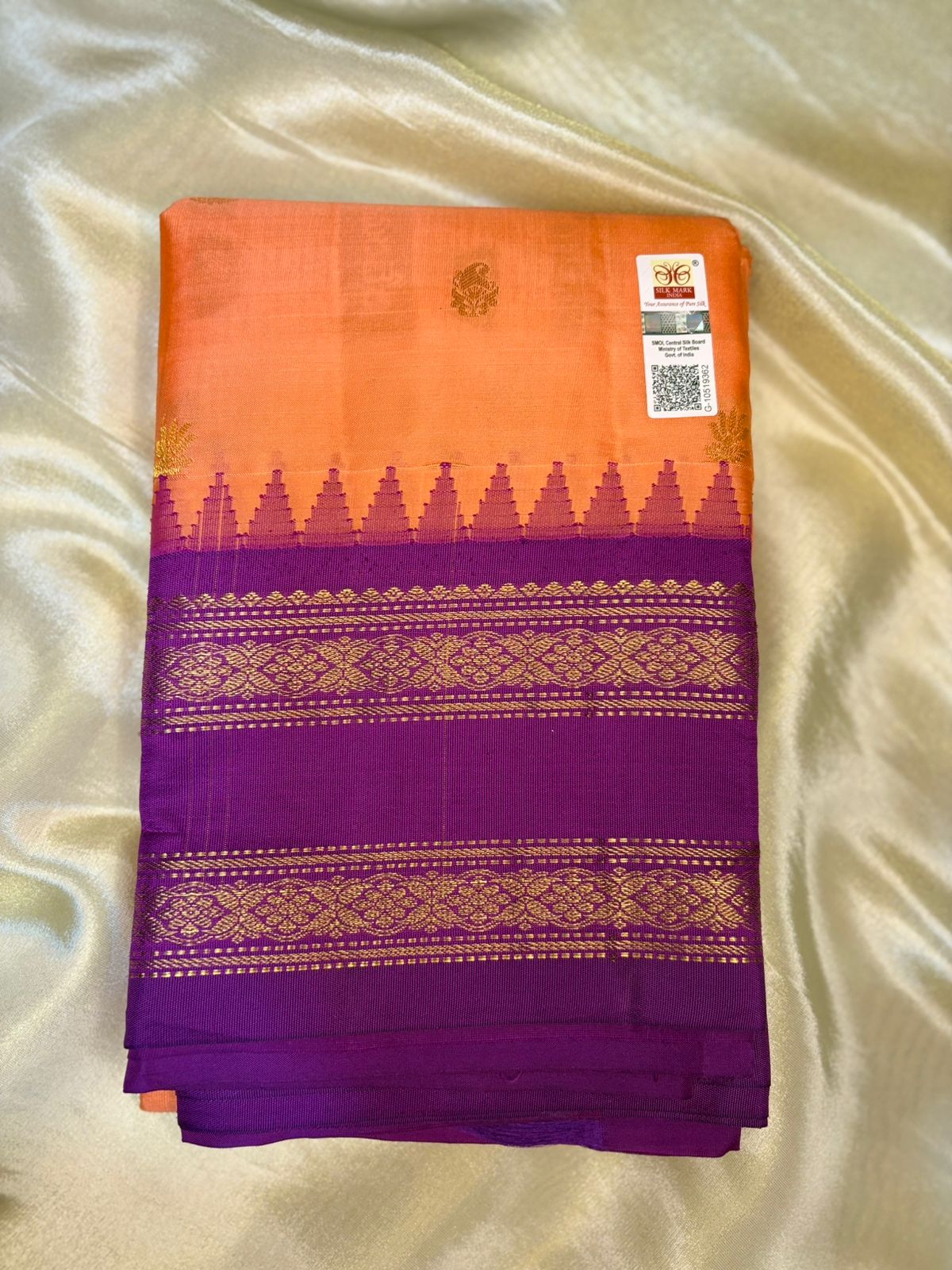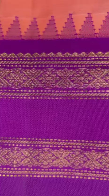 Gadwal Pattu Saree in a stunning dark peach silk body, perfectly paired with a rich contrast violet temple border and grand pallu. The luxurious zari detailing across the border and pallu adds a regal touch, while the deep, warm tones blend tradition with elegance. Crafted from pure silk and Silk Mark certified, this saree is a timeless drape for every grand celebration.