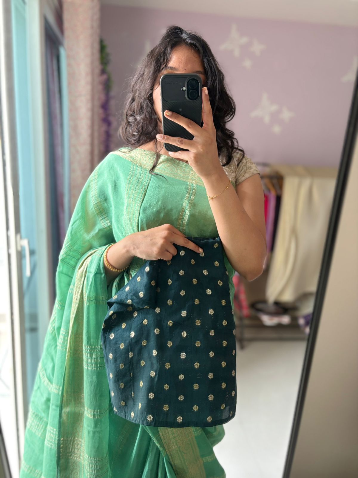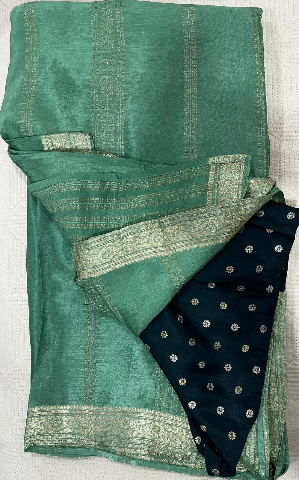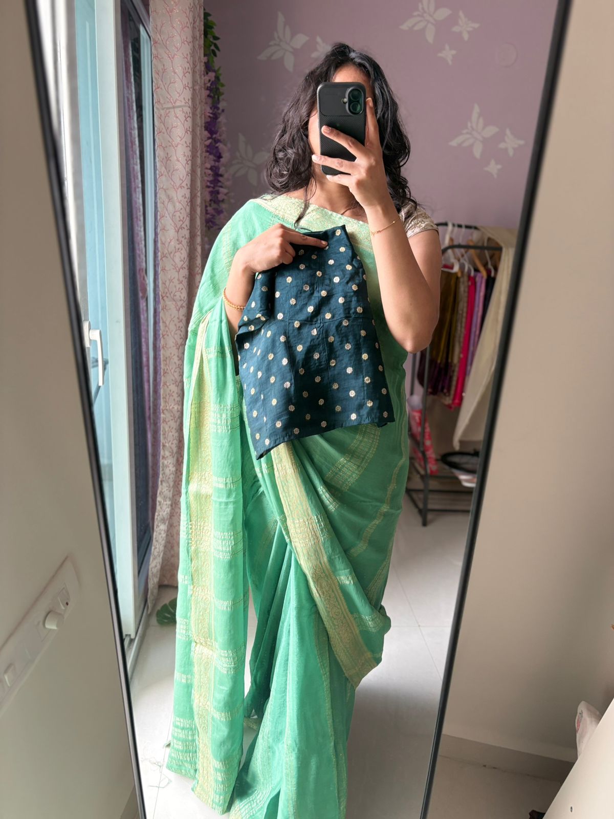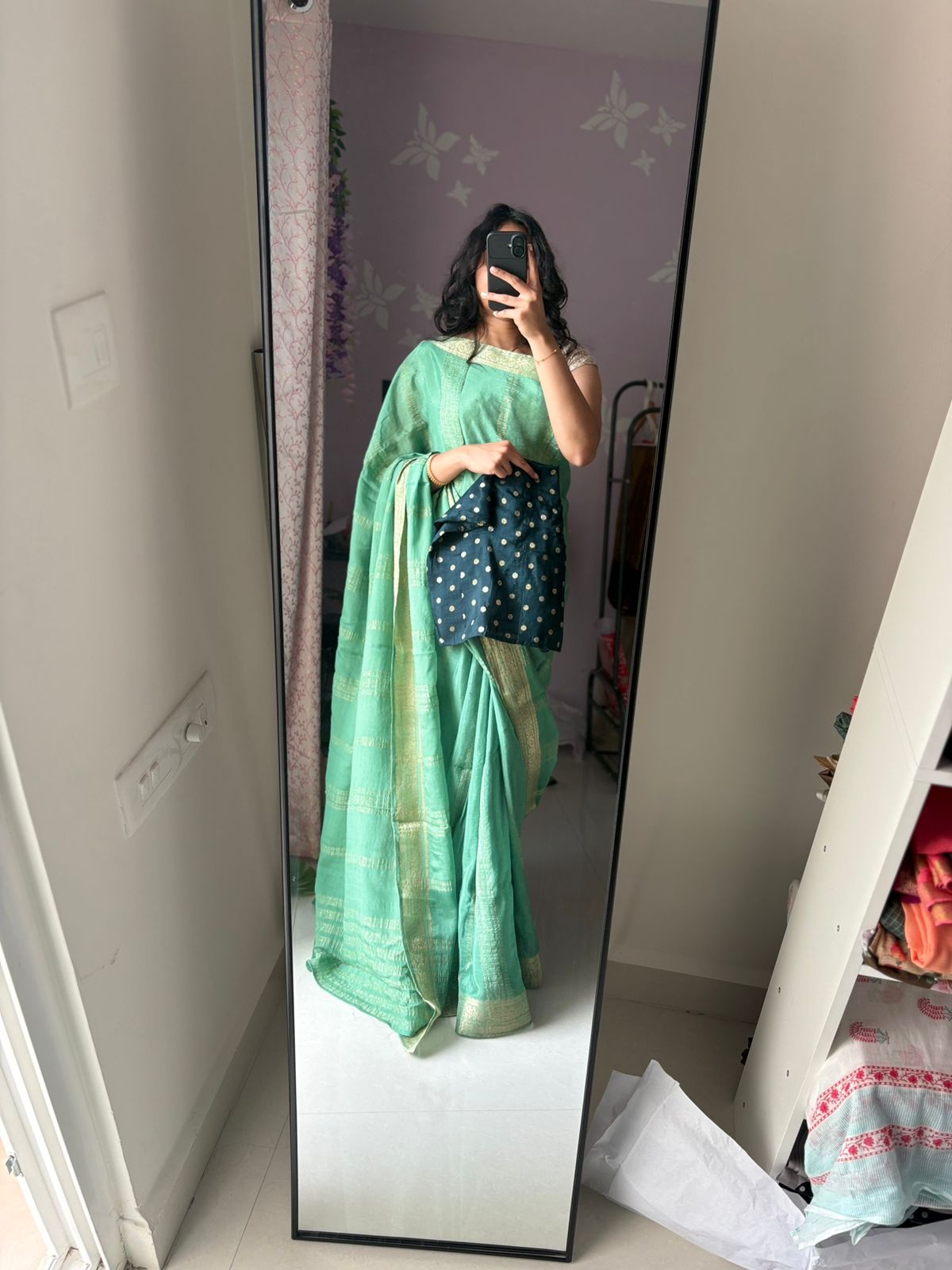 Graceful and lightweight, this wrinkle crepe saree comes in a beautiful turquoise green with a subtle sheen that catches the light effortlessly. The saree is adorned with zari-woven borders, adding just the right touch of traditional charm. It’s paired with a contrast dark turquoise green blouse, creating a refined and tasteful combination. Perfect for small gatherings, events, and intimate celebrations, this saree offers both comfort and understated elegance in one drape.