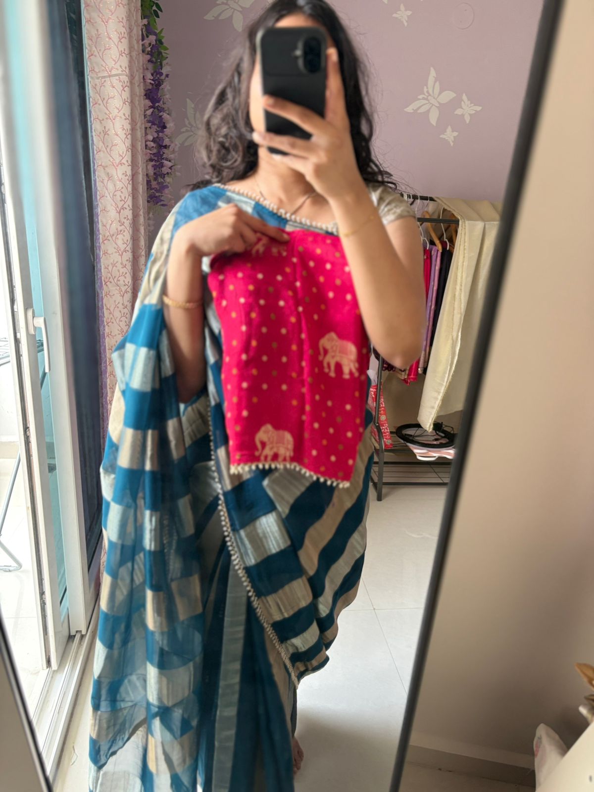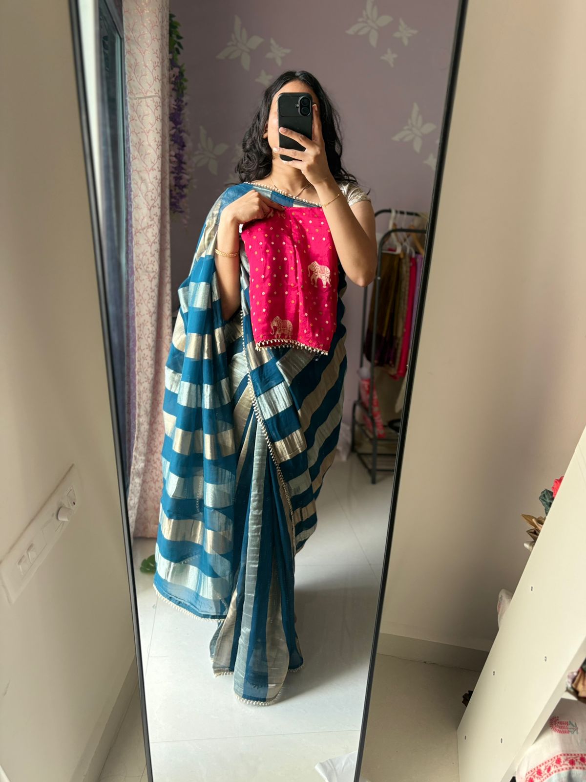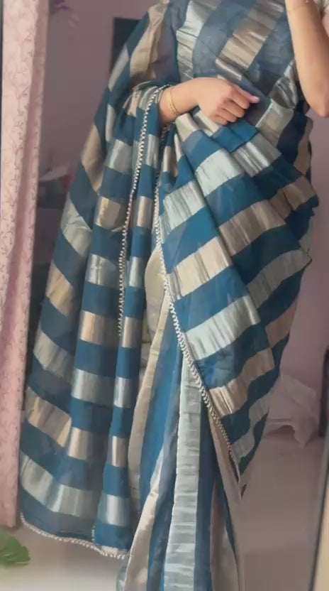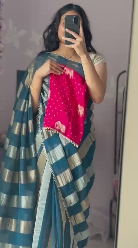 Elegant teal tissue saree with vertical silver & bronze zari lines, finished with a pearl bead lace border. Paired with a rani pink Banarasi blouse featuring elephant motifs and buttas, enhanced with pearl & glass bead lace. A perfect pick for festive gatherings and intimate celebrations.