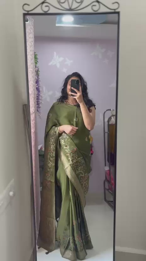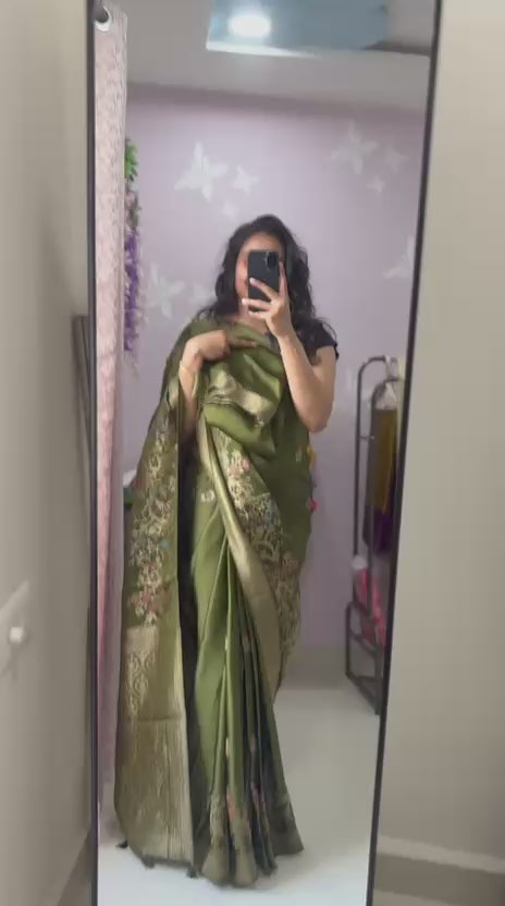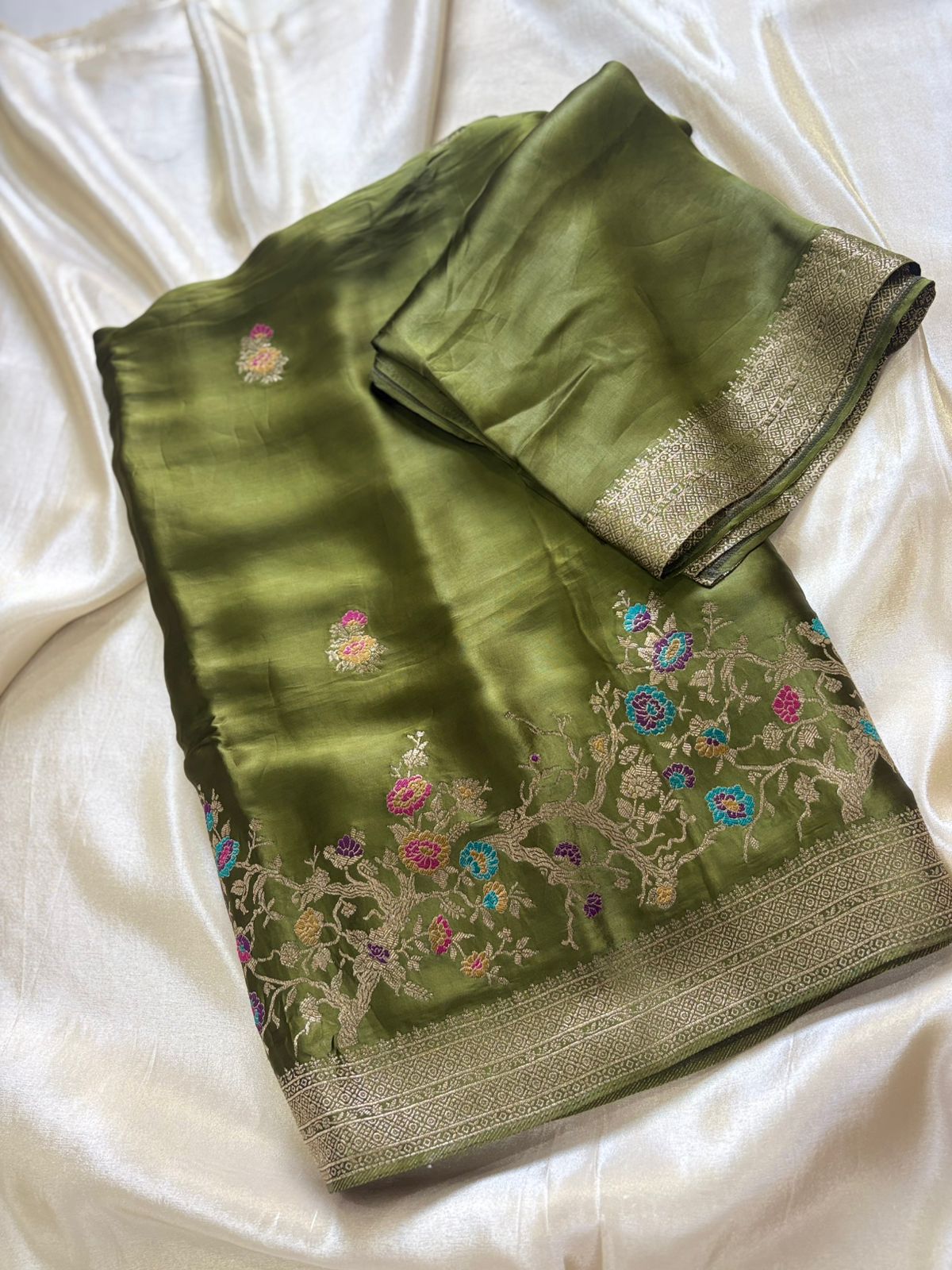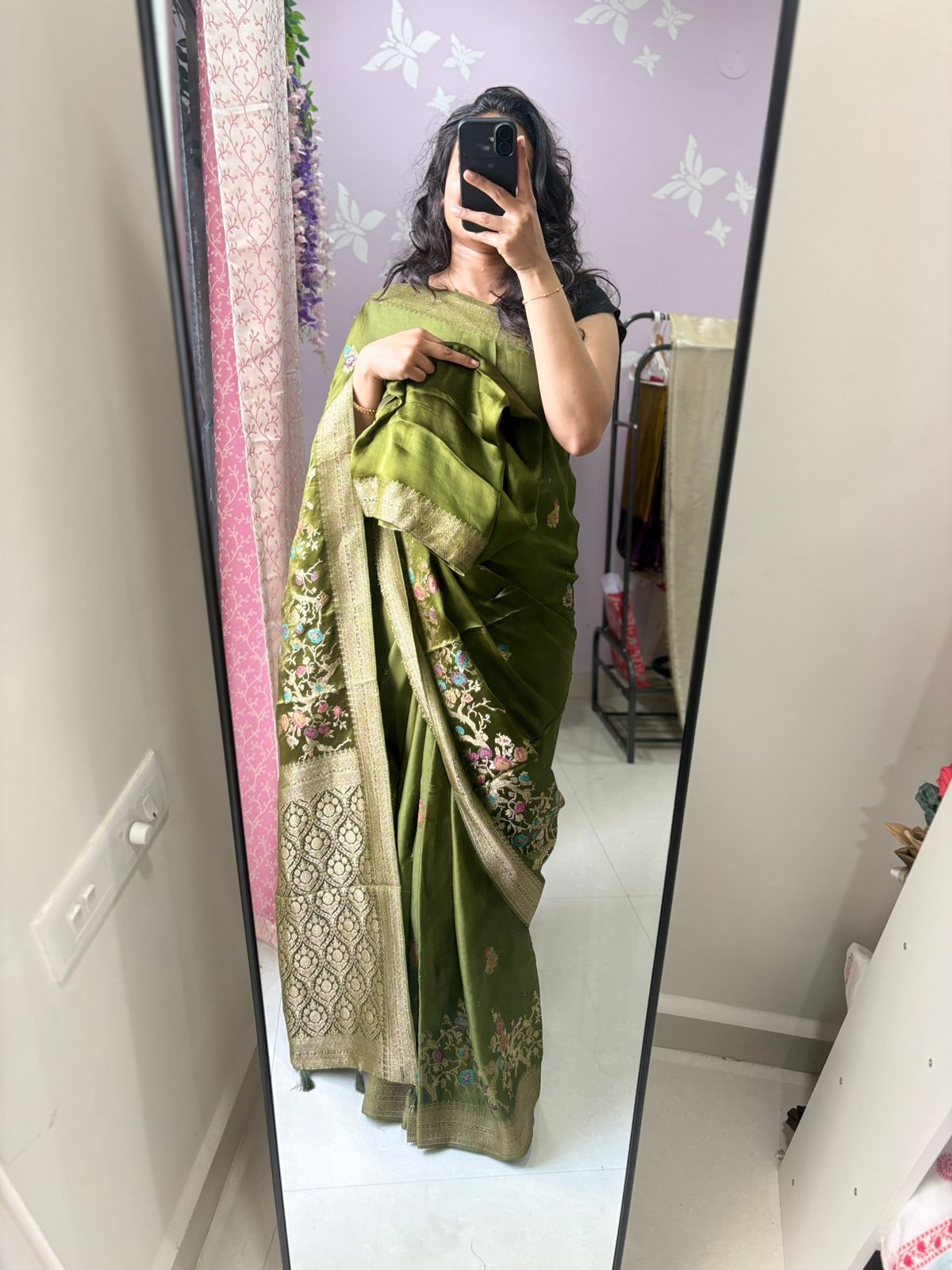 Elevate your style with this mehendi green pure Chinon crepe silk saree, adorned with all-over Meenakari work that brings a delicate blend of tradition and artistry. The soft, flowing texture of crepe silk paired with the intricate detailing makes it both elegant and effortlessly chic—a perfect choice for festive occasions, cocktail evenings, or intimate celebrations.