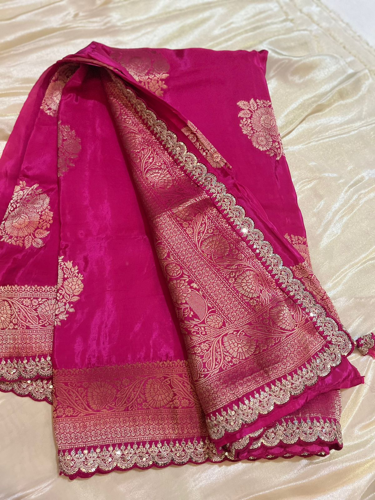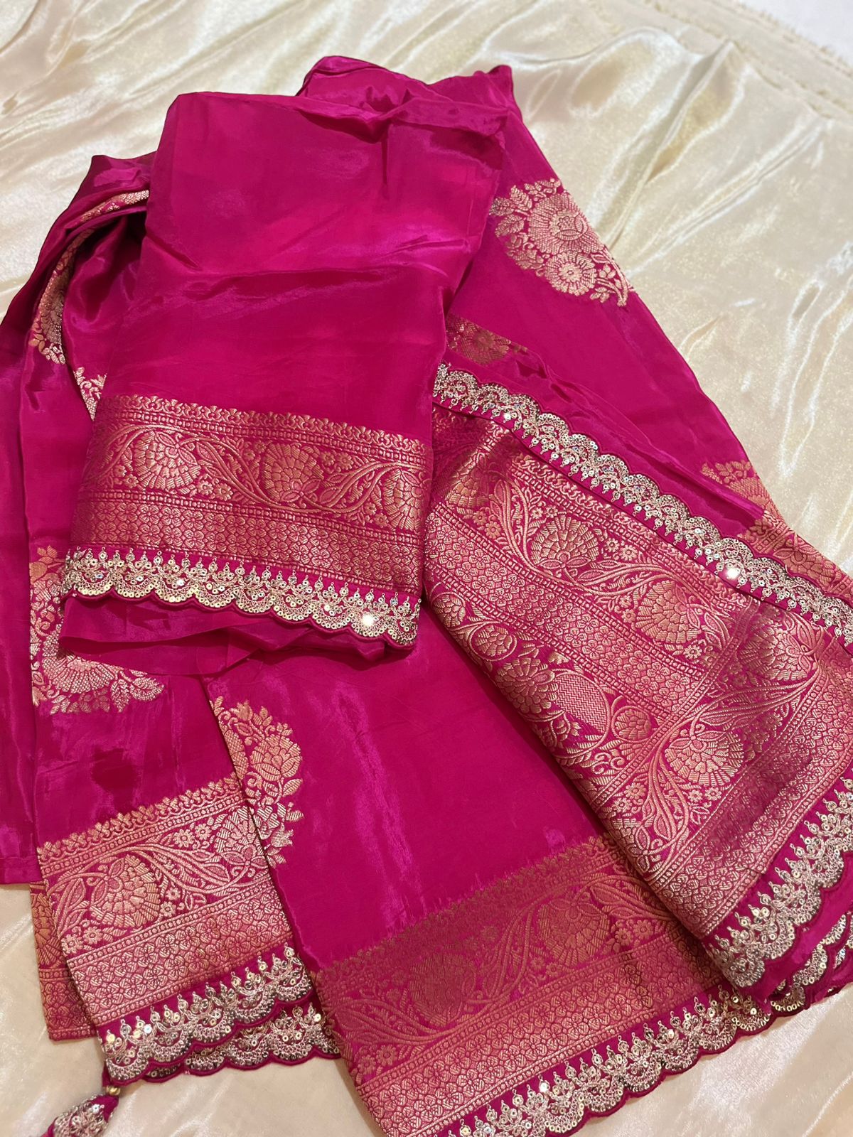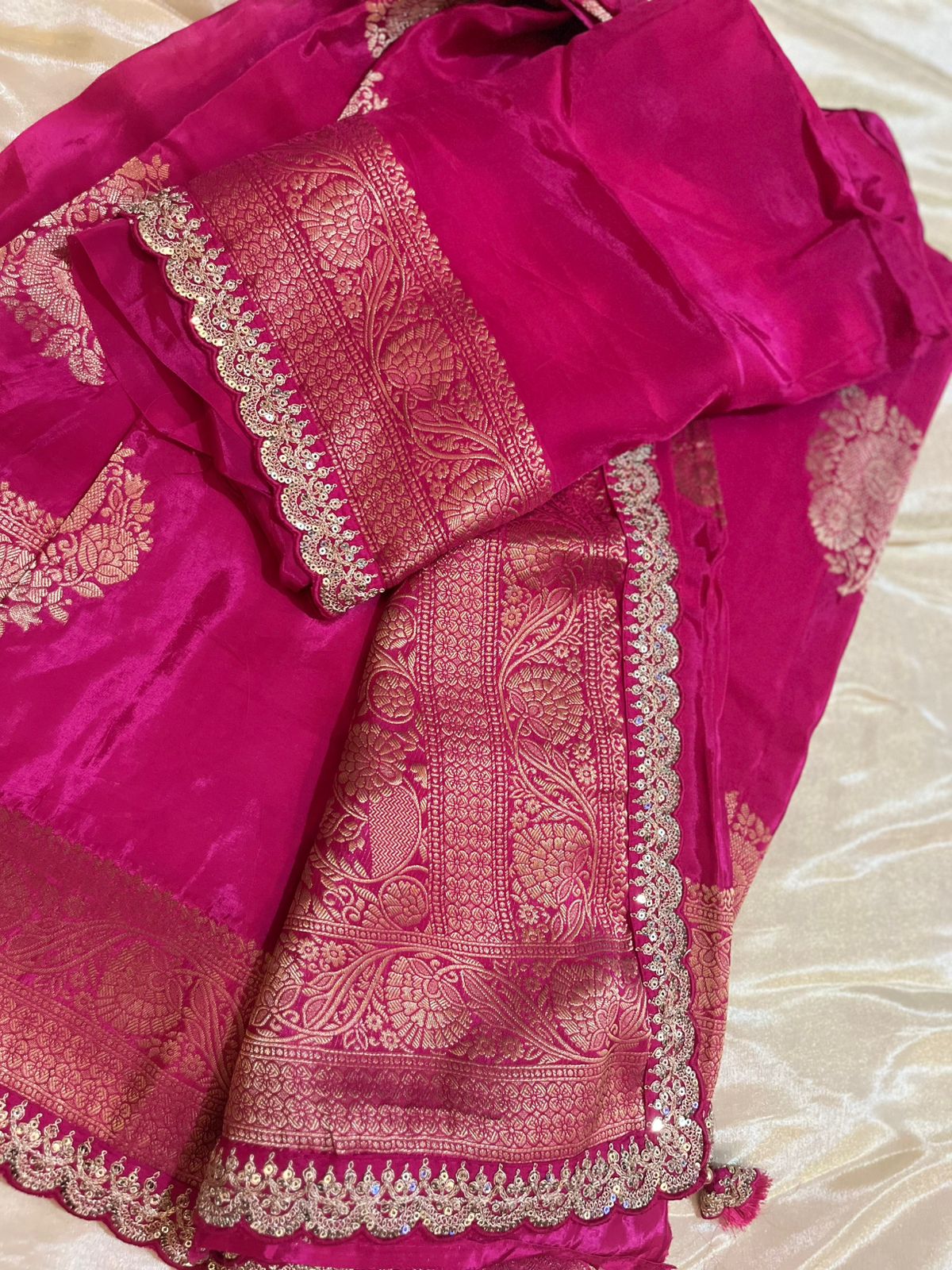 Crafted in pure crepe, this saree offers a refined sheen and a gentle drape that contours fluidly around the body. The fabric’s soft yet structure-rich feel ensures pleats stay crisp while the pallu falls in a serene cascade. A meticulously Maggam lace border—adds depth and artisanal charm. The overall aesthetic is modern, poised, and understated—designed for the wearer who seeks subtle refinement.