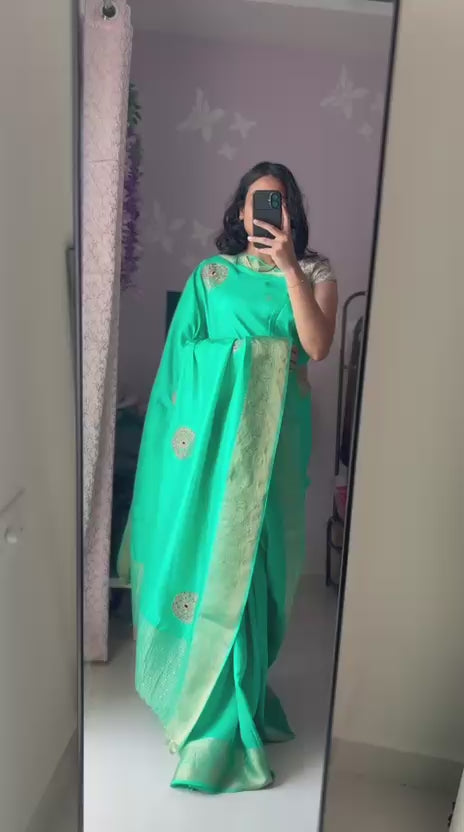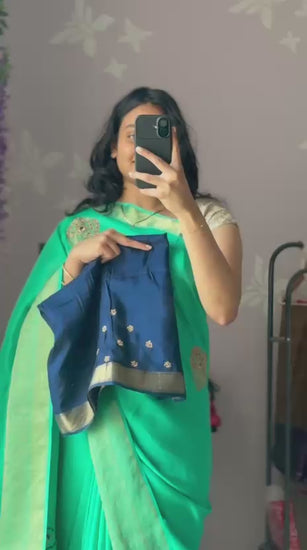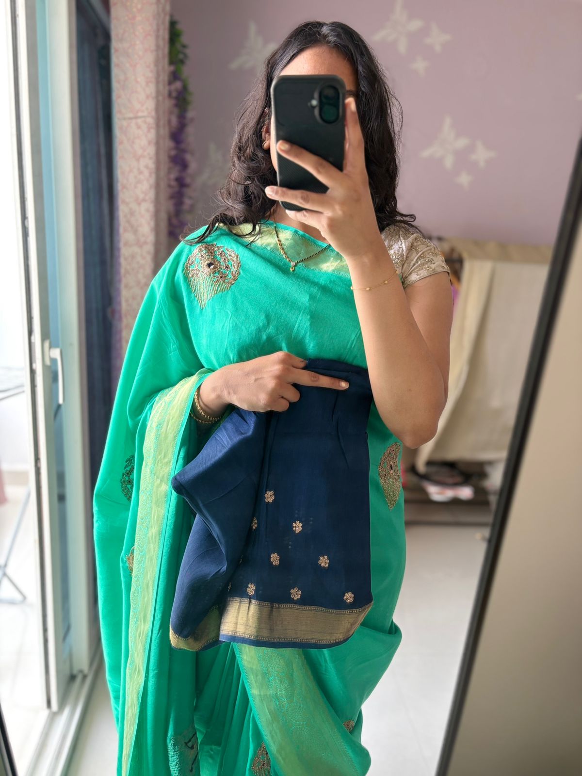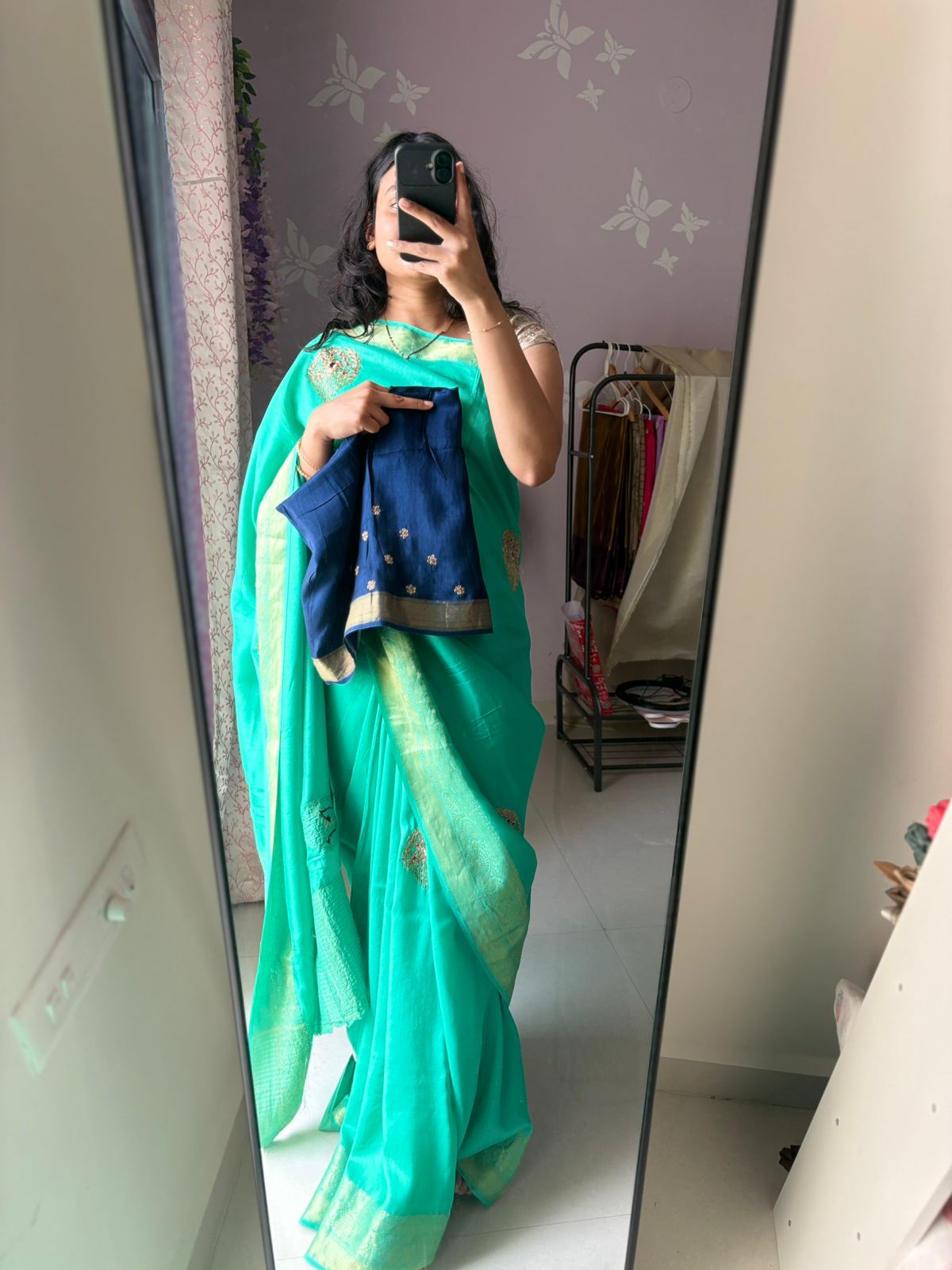 Make a graceful statement with this elegant turquoise green saree, featuring delicate handwork motifs scattered beautifully across the drape. The intricate detailing adds a touch of artisanal charm, while the rich dark blue blouse creates a striking contrast, balancing tradition with a modern edge. Perfect for daytime functions, festive gatherings, or evening events, this ensemble blends subtle sophistication with timeless appeal.