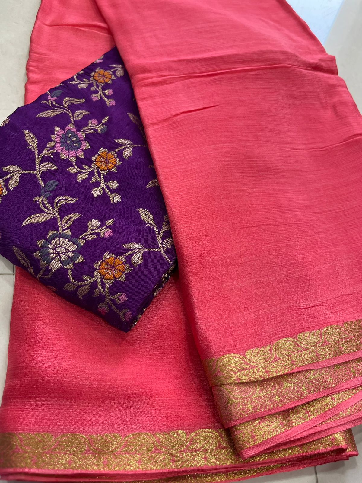 Keep it elegant and effortless with this soft Chinon saree, featuring a delicate small border that adds just the right touch of detail. Paired with a contrast Banarasi blouse, it beautifully balances simplicity with tradition. Perfect for home pujas, small gatherings, or festive rituals, this saree is all about comfort with understated charm.