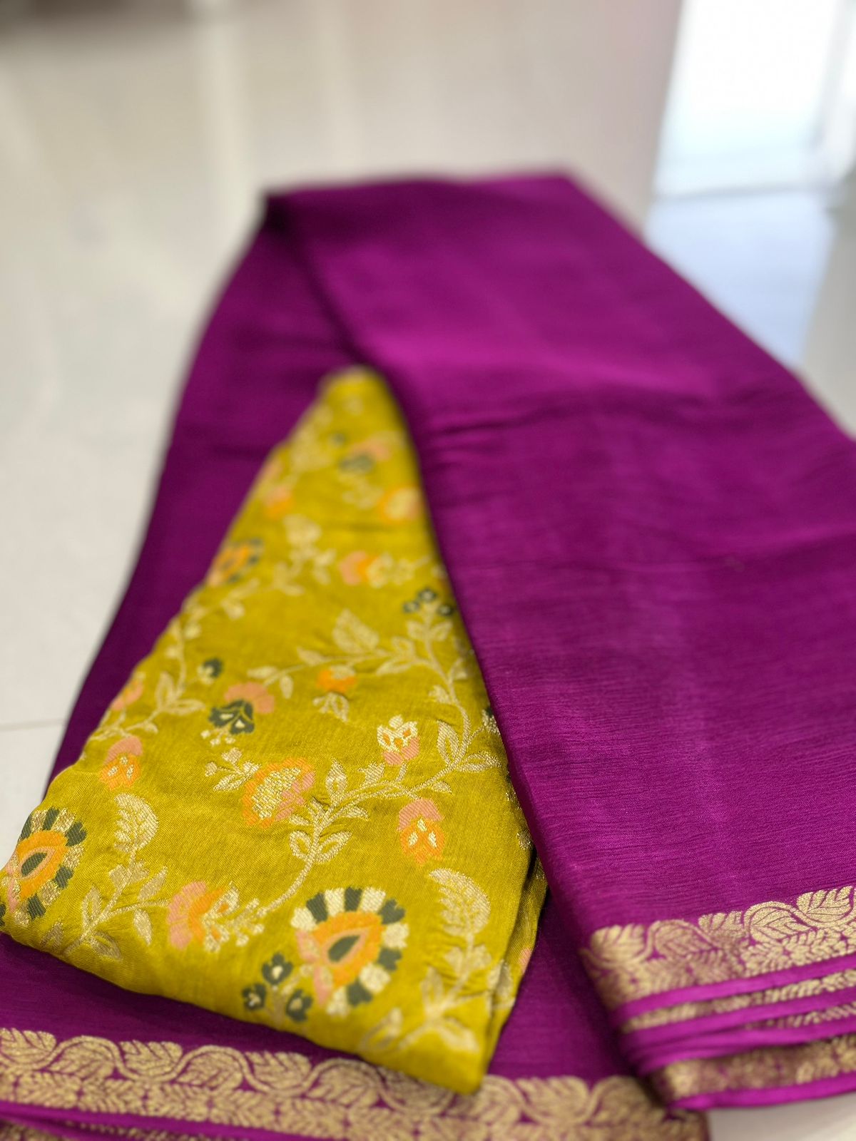 Keep it elegant and effortless with this soft Chinon saree, featuring a delicate small border that adds just the right touch of detail. Paired with a contrast Banarasi blouse, it beautifully balances simplicity with tradition. Perfect for home pujas, small gatherings, or festive rituals, this saree is all about comfort with understated charm.