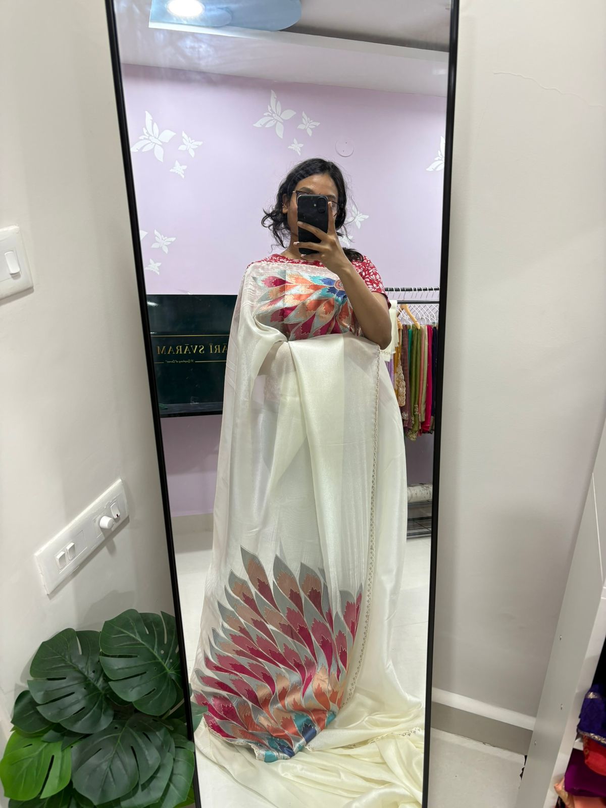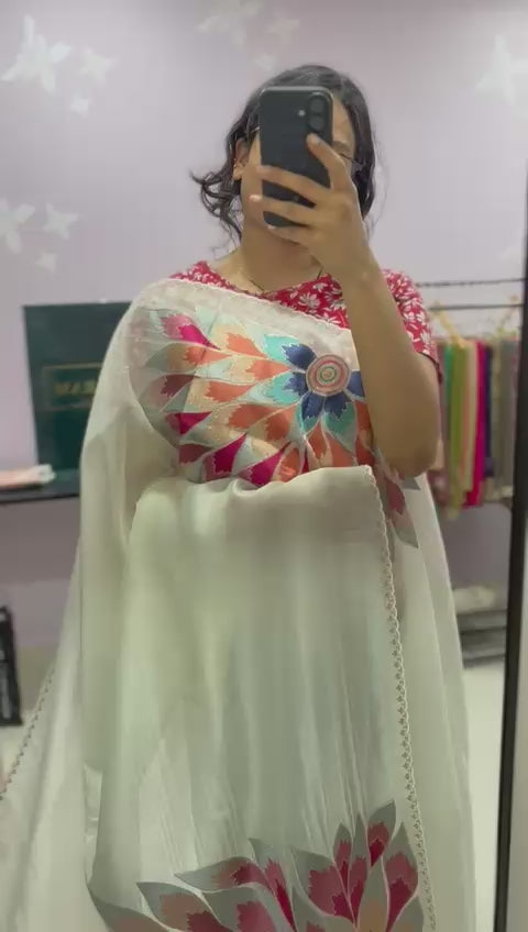 Ethereal and refined, this white organza saree features a delicate scallop border that adds soft elegance to its sheer beauty. The highlight is a statement floral thread embroidery, artistically placed at the pallu end and around the neckline area, giving it a modern, handcrafted touch. Light, airy, and effortlessly stylish—this saree is perfect for daytime events, intimate functions, or elegant summer occasions.