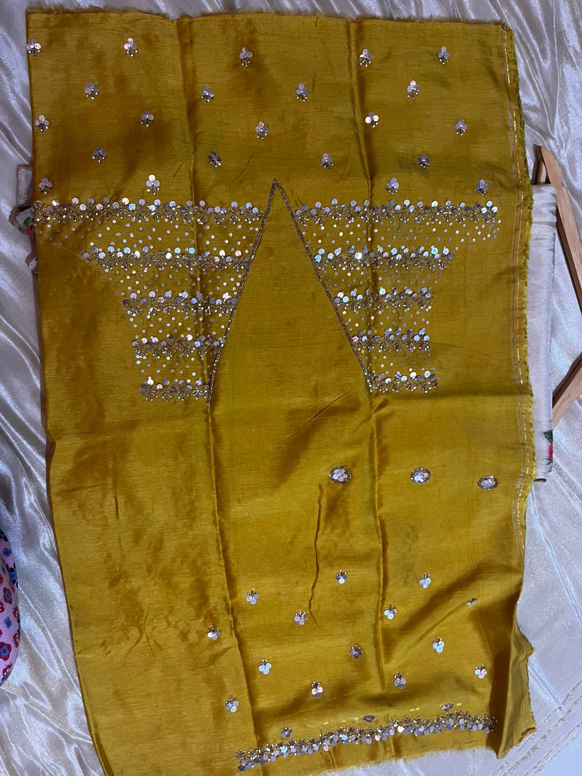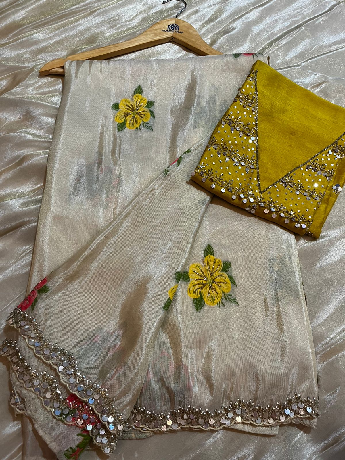 Grace meets grandeur in this pure beige tissue saree, featuring a striking hand chip and beadwork border, enhanced with thread-embossed floral motifs and intricate bead embellishments throughout. The soft sheen of tissue fabric is elevated with rich, artisanal detailing, making it perfect for special occasions. Paired with a heavy contrast embroidered blouse, designed with attention to detail on both the front and back neck, this ensemble blends traditional craftsmanship with sophisticated charm.