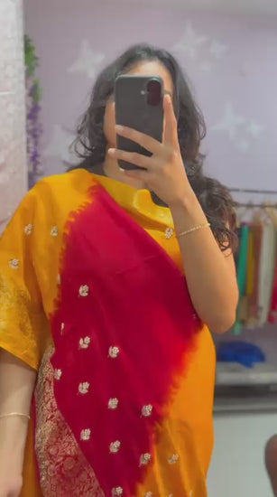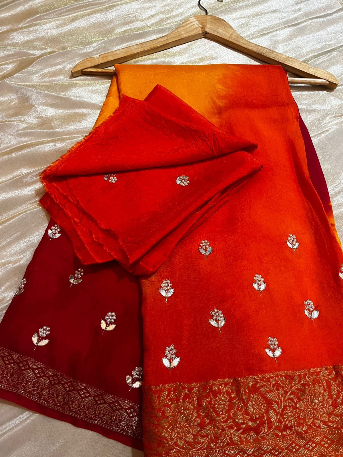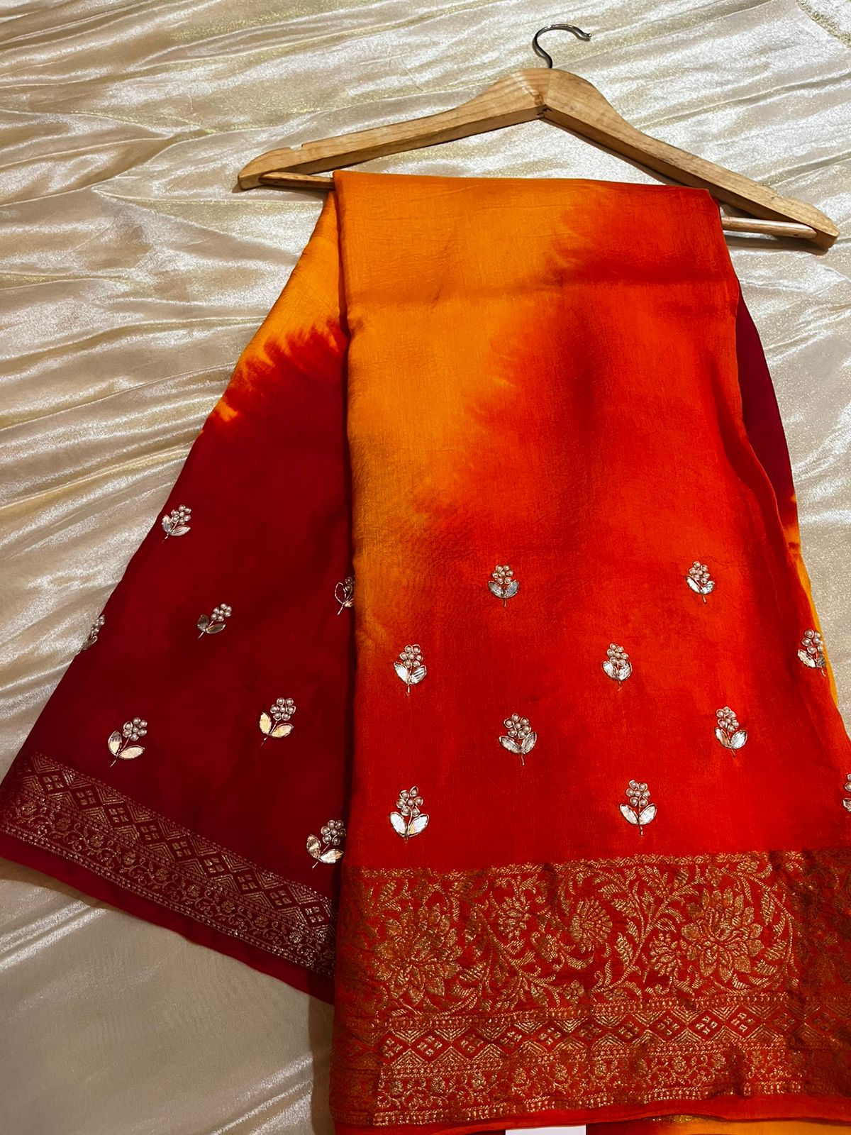 Bright and breezy, this tie-and-dye chiffon saree features a vibrant blend of orange, red, and yellow hues, creating a lively and cheerful drape. Accented with delicate floral butties and finished with a subtle zari border, it strikes the perfect balance between festive and effortless. Paired with a contrast red blouse, this saree is an ideal pick for small gatherings, daytime functions, or casual festive events.