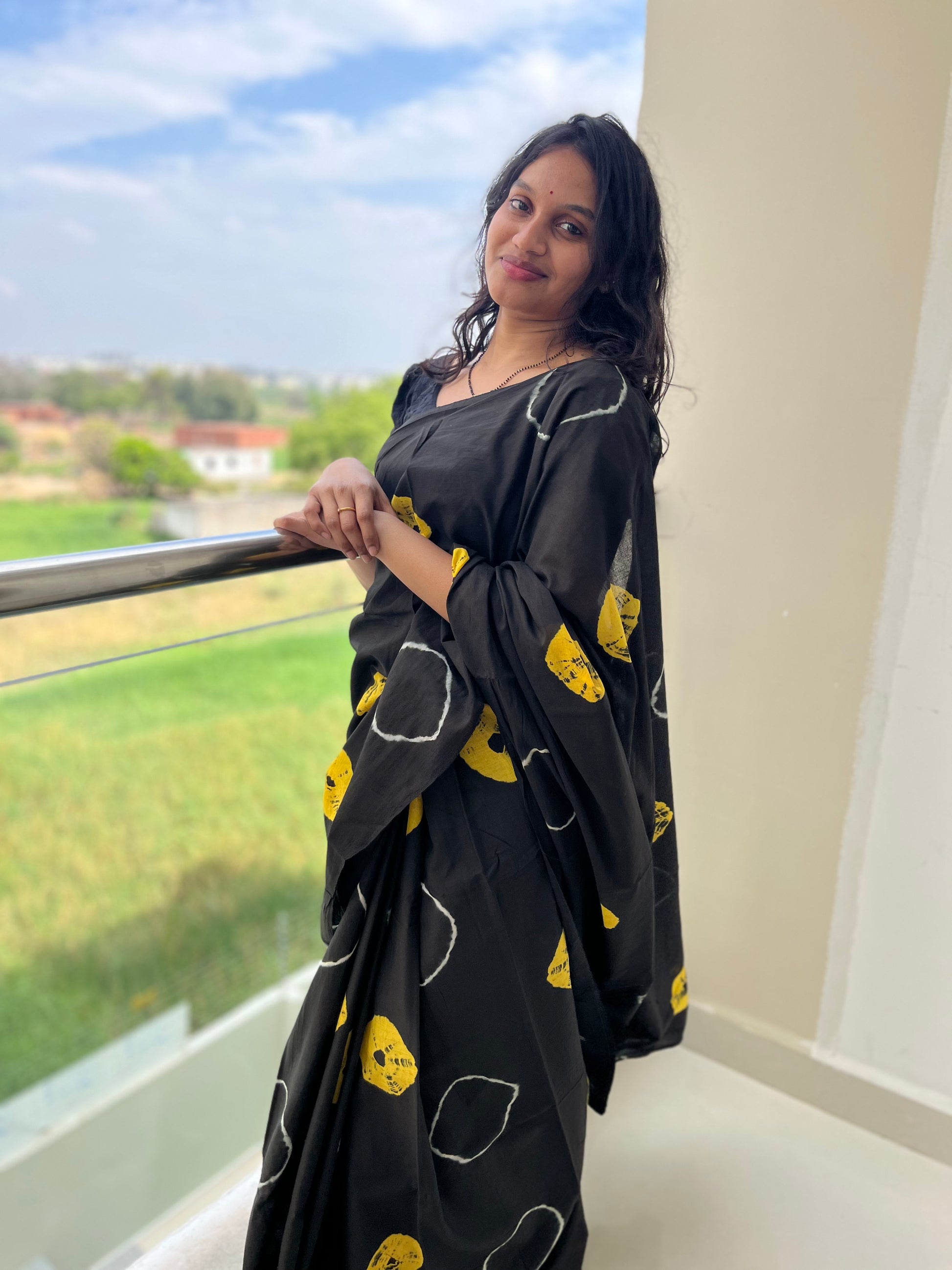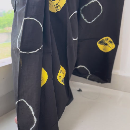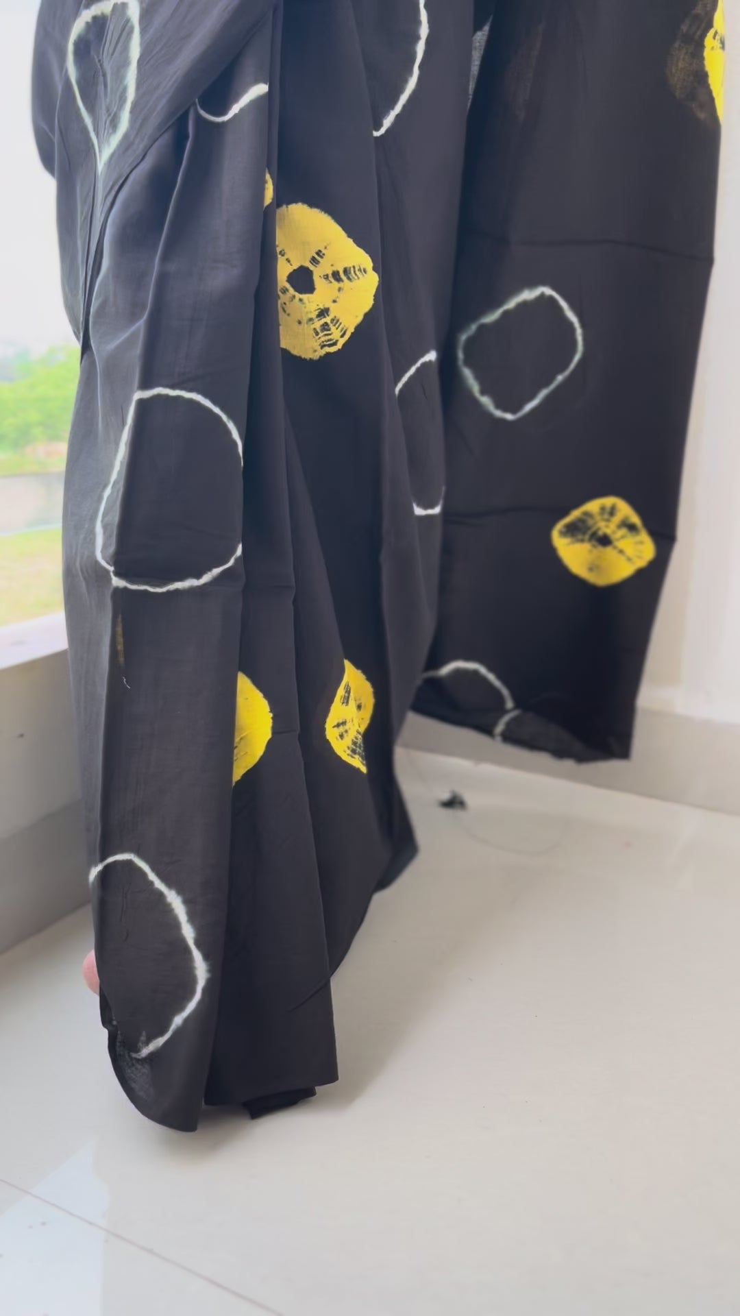 Wrapped in the airy softness of mul (mulmul) cotton, this saree boasts a dramatic black base accented by hand-dyed yellow motifs. The crisp, geometric patterns highlight traditional tie-dye techniques that create visible variations—meaning every drape is inherently unique. Stylish, breathable, and handcrafted—this saree effortlessly merges visual intrigue with comfort, making it perfect for statement-day or evening occasions.