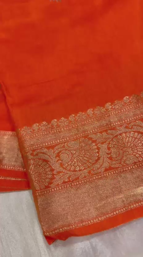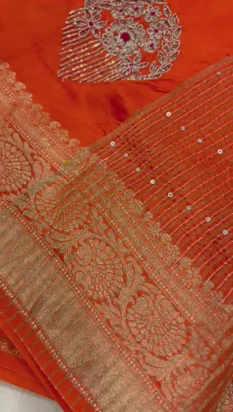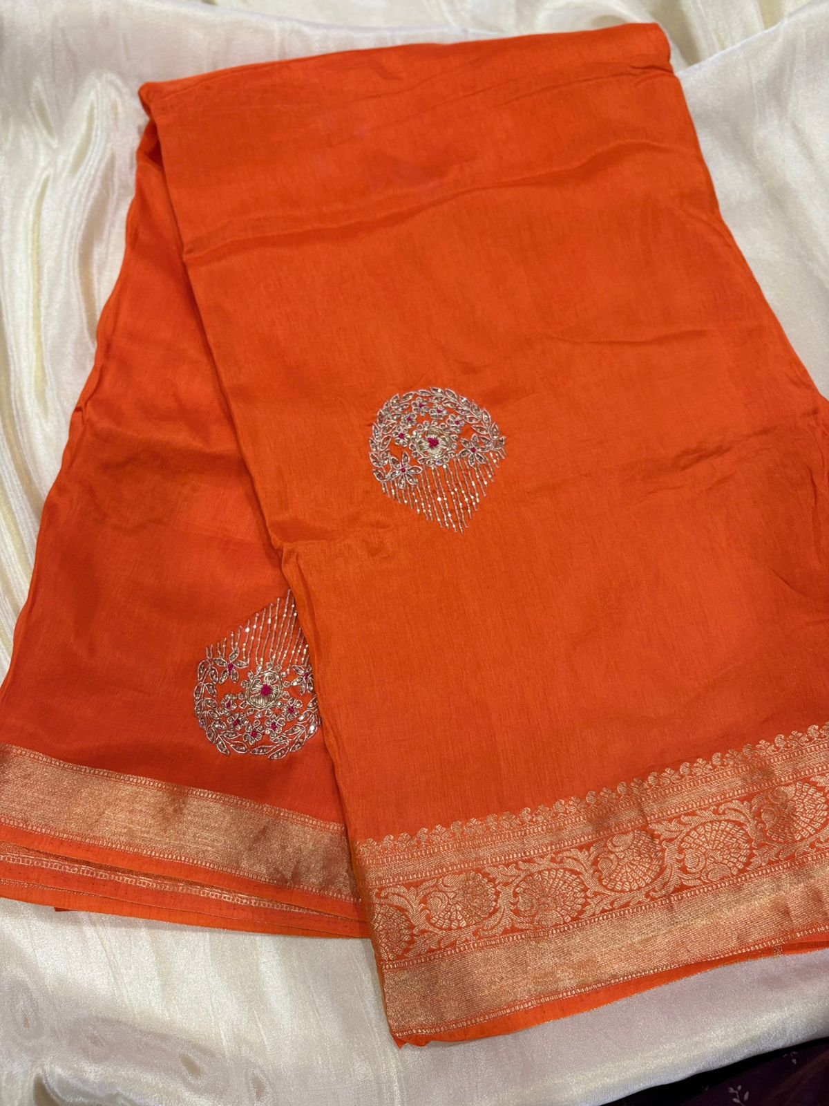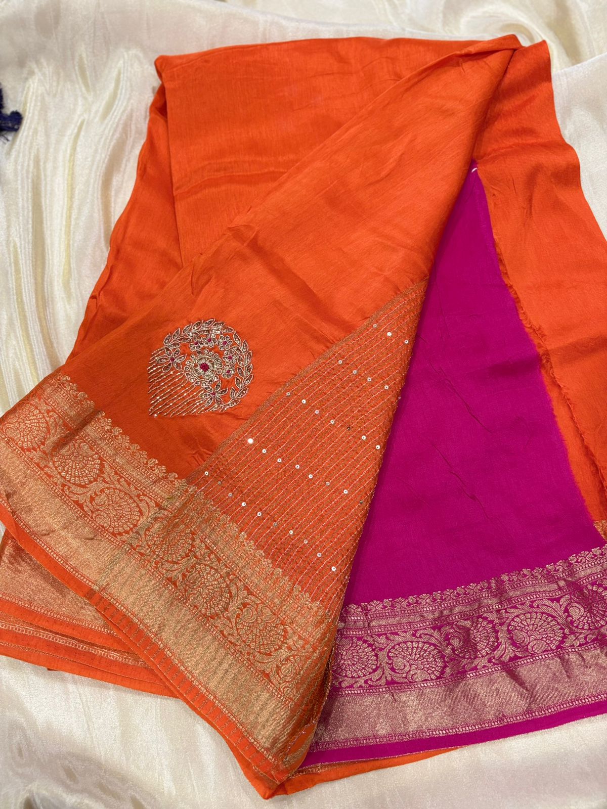 Make a graceful statement with this elegant Orange saree, featuring delicate handwork motifs scattered beautifully across the drape. The intricate detailing adds a touch of artisanal charm, while the rich dark pink blouse creates a striking contrast, balancing tradition with a modern edge. Perfect for daytime functions, festive gatherings, or evening events, this ensemble blends subtle sophistication with timeless appeal.