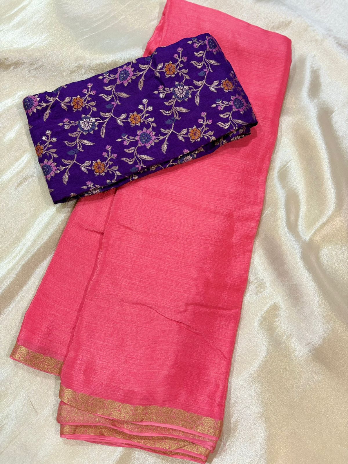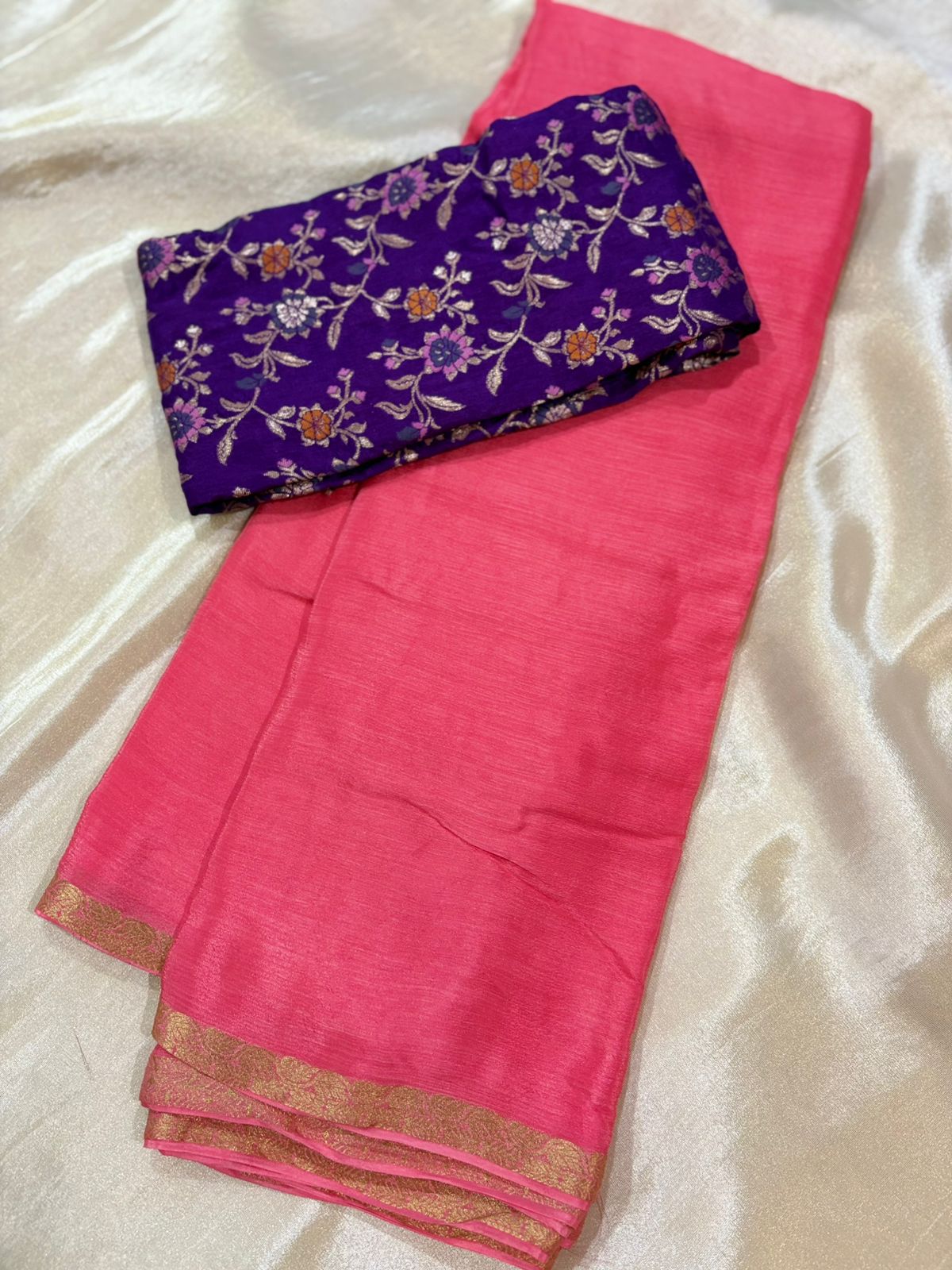 Keep it elegant and effortless with this soft Chinon saree, featuring a delicate small border that adds just the right touch of detail. Paired with a contrast Banarasi blouse, it beautifully balances simplicity with tradition. Perfect for home pujas, small gatherings, or festive rituals, this saree is all about comfort with understated charm.
