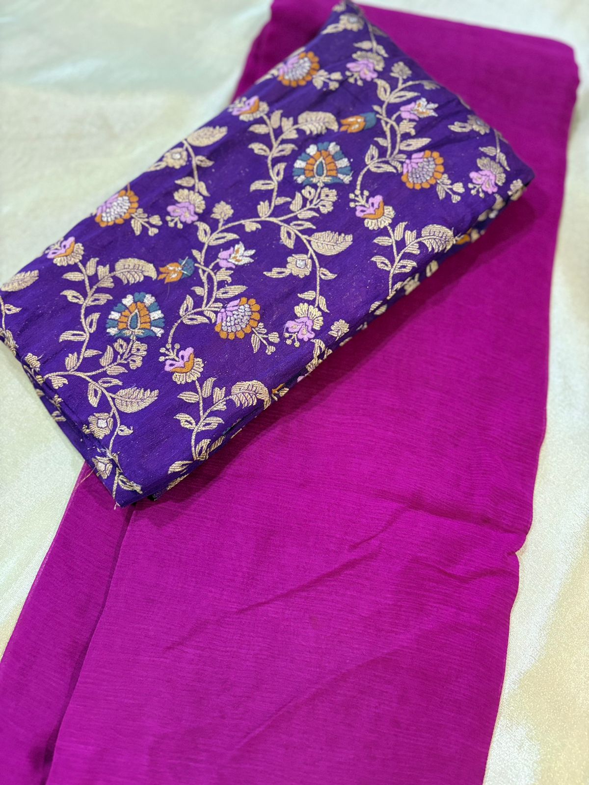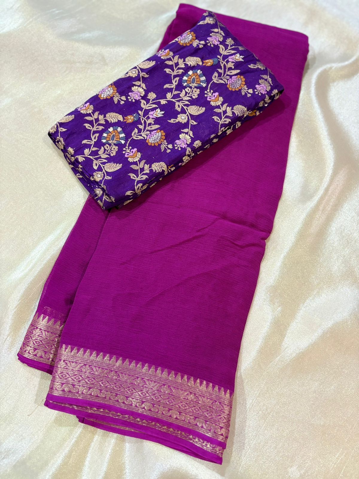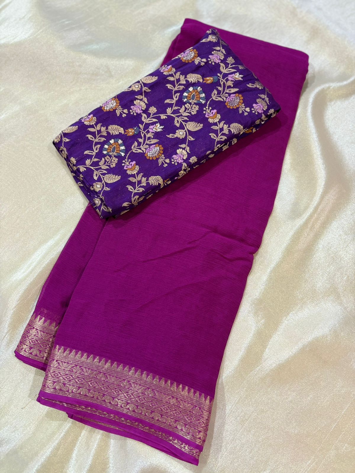 Keep it elegant and effortless with this soft Chinon saree, featuring a delicate small border that adds just the right touch of detail. Paired with a contrast Banarasi blouse, it beautifully balances simplicity with tradition. Perfect for home pujas, small gatherings, or festive rituals, this saree is all about comfort with understated charm.