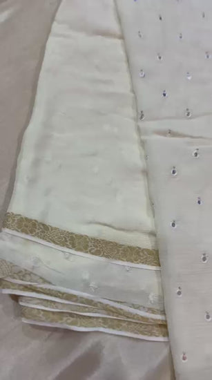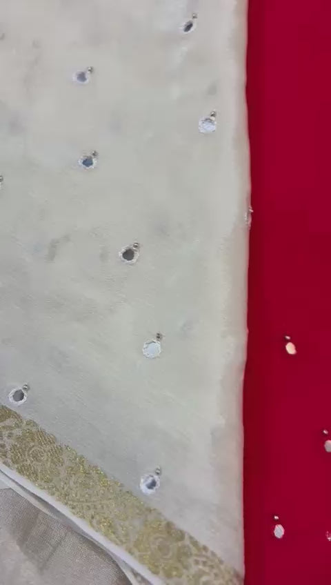 Drift into grace with this soft Beige pure Crepe saree—light as air, beautifully pleated, Paired with a vibrant red blouse in silk with mirror details all over saree and zari woven border, the ensemble balances ethereal poise with the warmth of color. Perfect for festive luncheons or intimate evening events, it blends comfortable breathability with modern sophistication.