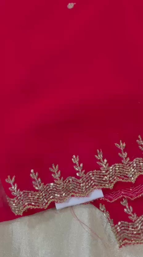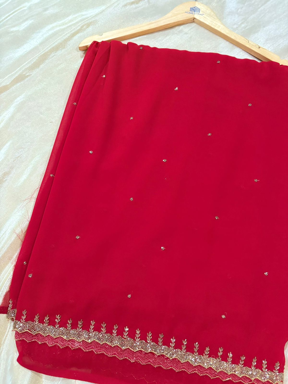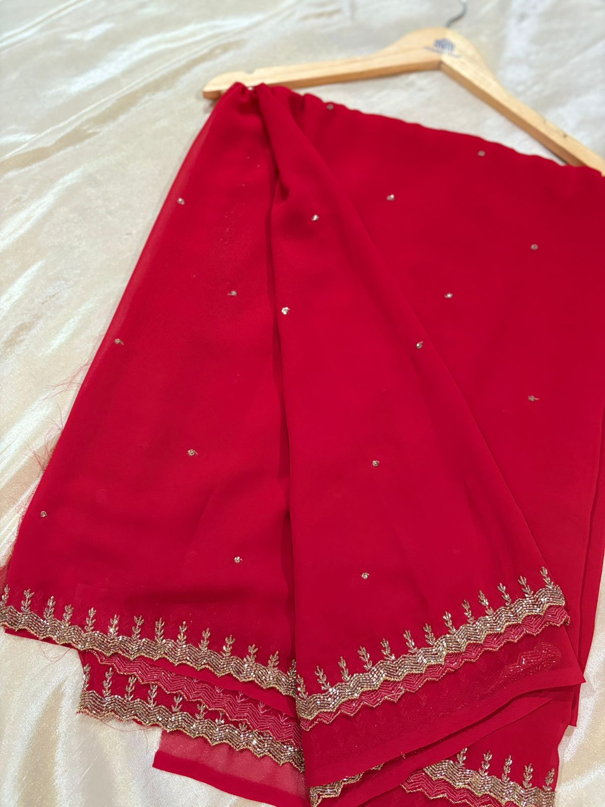 ✨ "Red georgette saree adorned with delicate golden glass bead handwork and a scalloped border – a blend of simplicity and timeless elegance."
