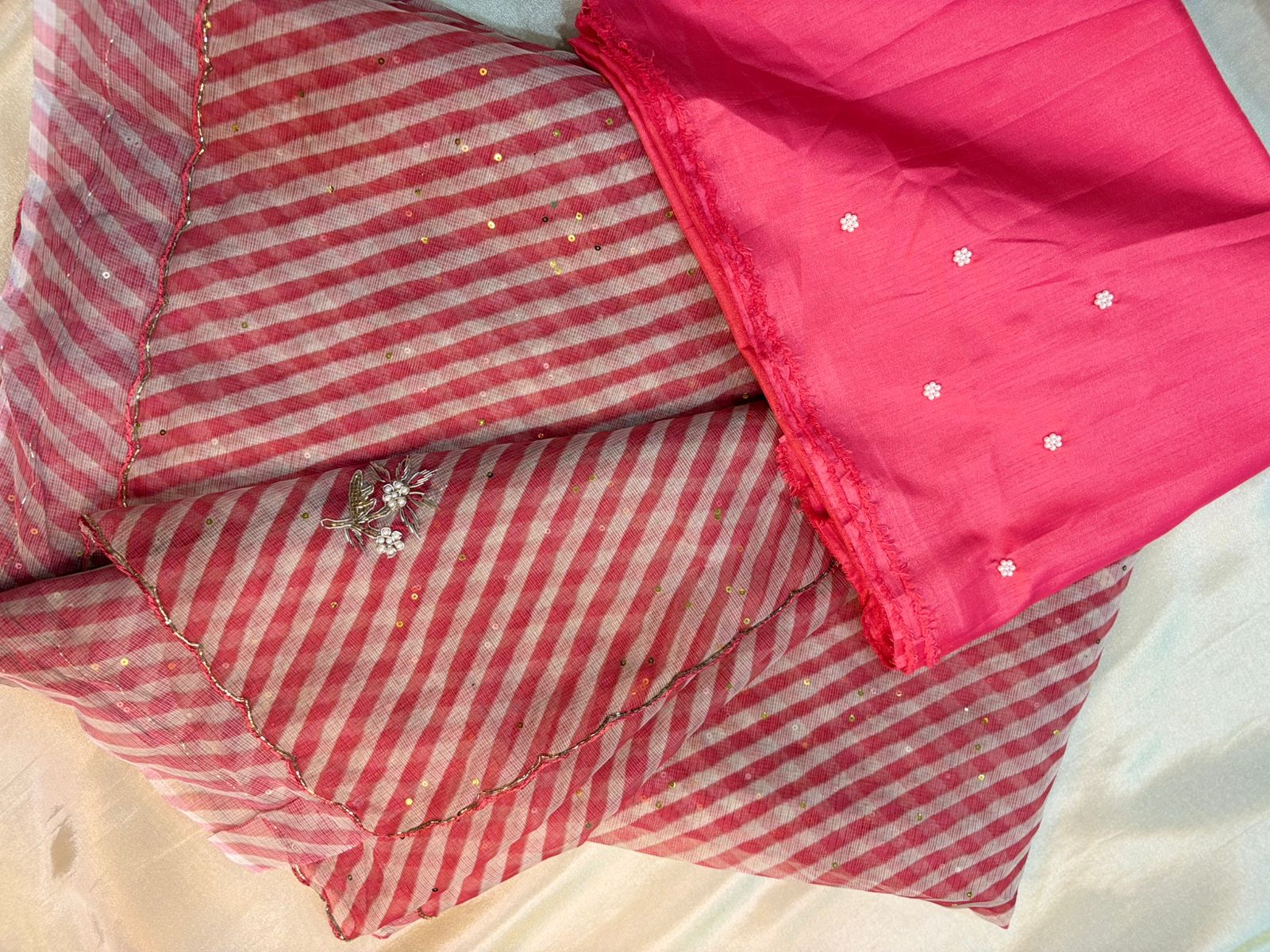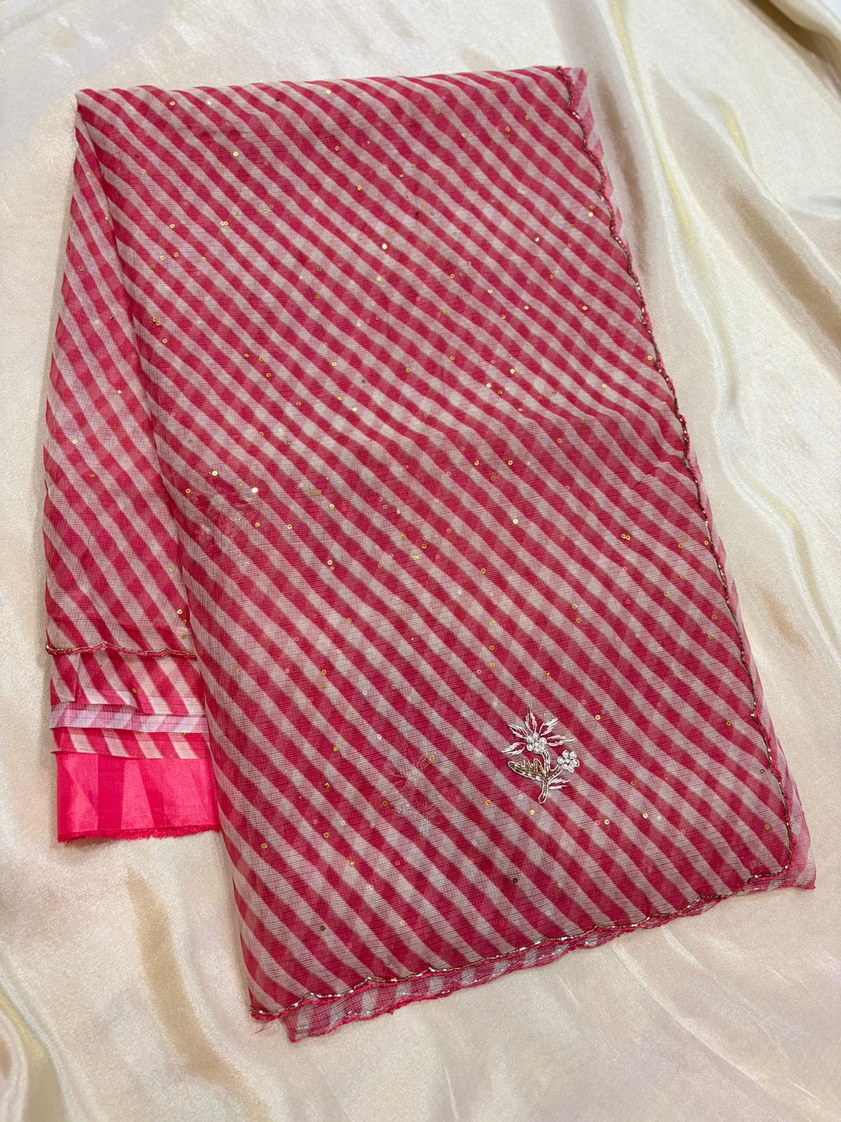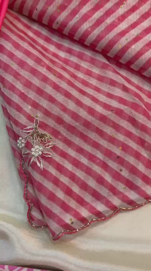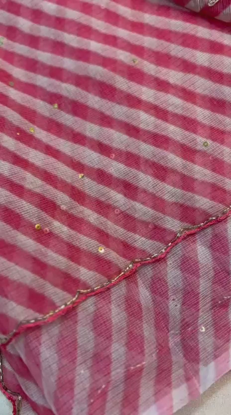 This kota saree adorned with delicate glass bead scallop edges and intricate handwork flower motifs is elegance woven into every detail. Paired with a plain dark pink raw silk blouse, it’s a perfect blend of grace and simplicity. 🌸💫