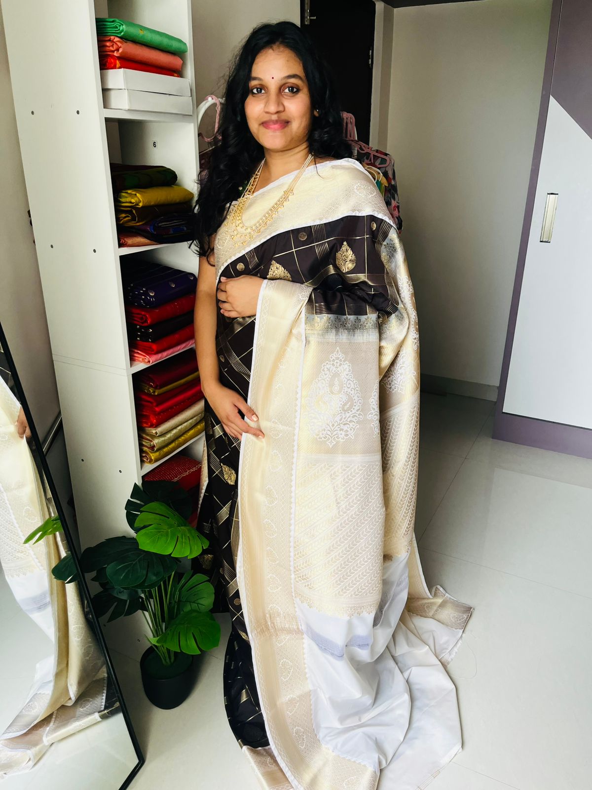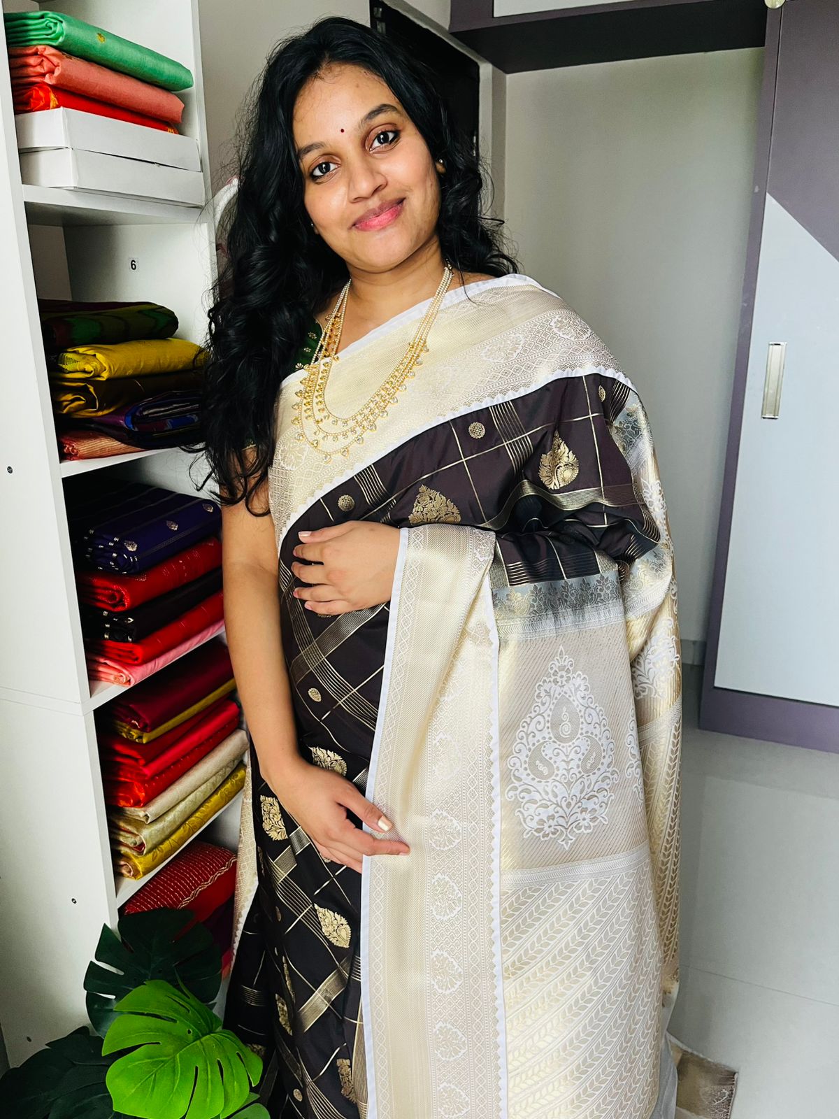 This exquisite drape in brown and off-white features delicate Thilagam and mini Ruthracham motifs intricately woven across the body – symbols of grace and divinity.